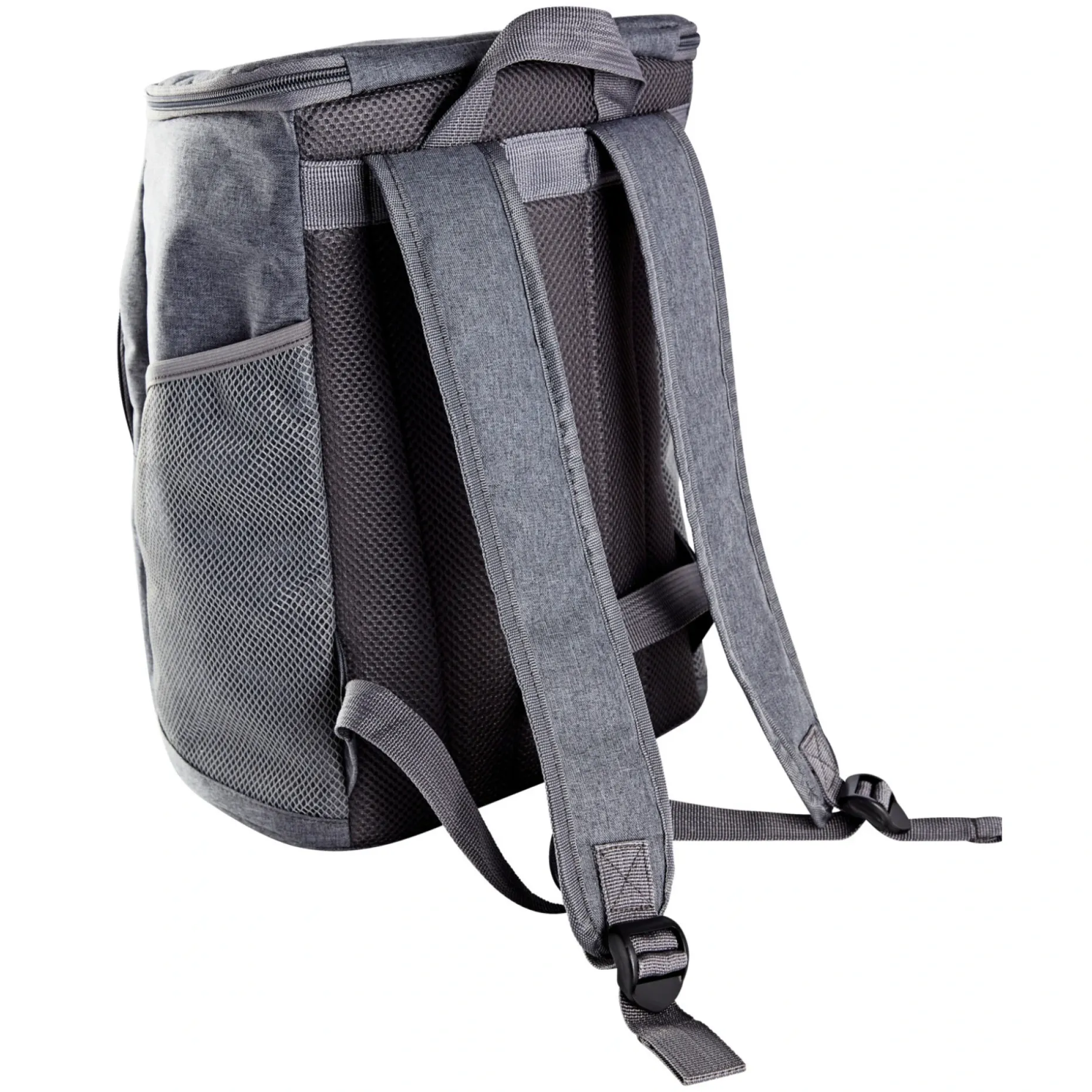 Bæres som rygsæk. Med udvendig lynlåslomme og sidelomme til flaske. 100% grå polyester.
