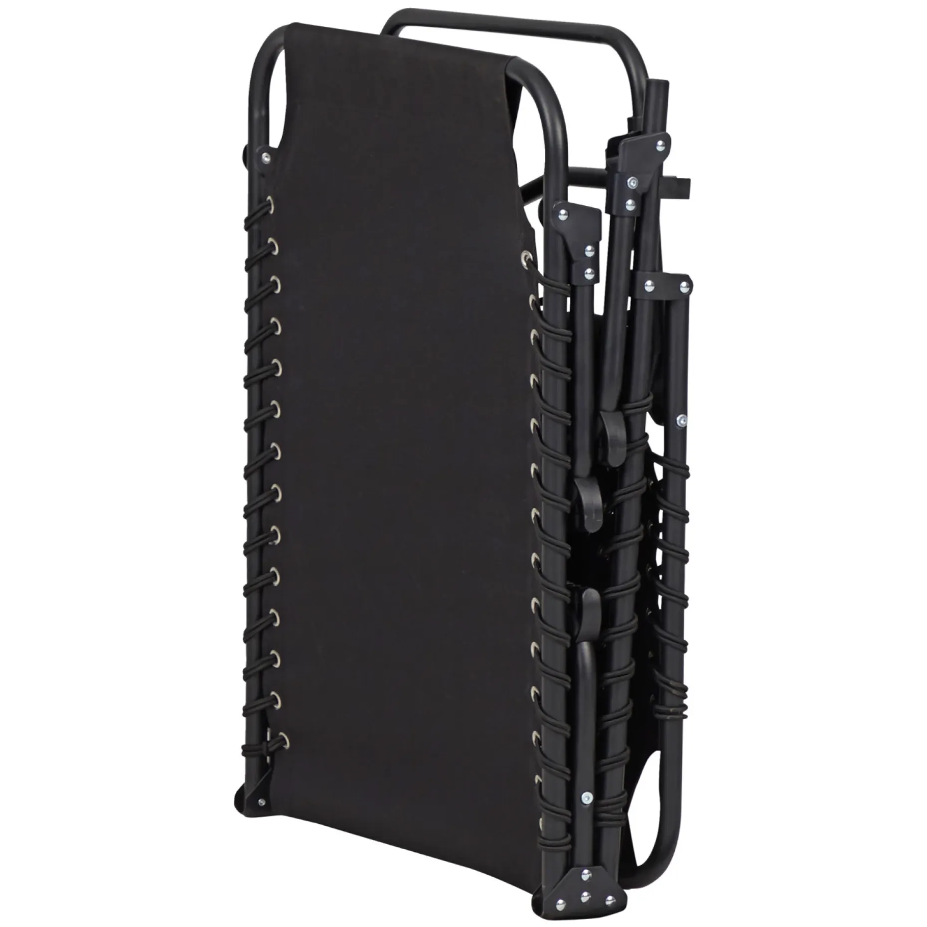 Foldbar solseng med sortlakeret metalstel og sort texteline.