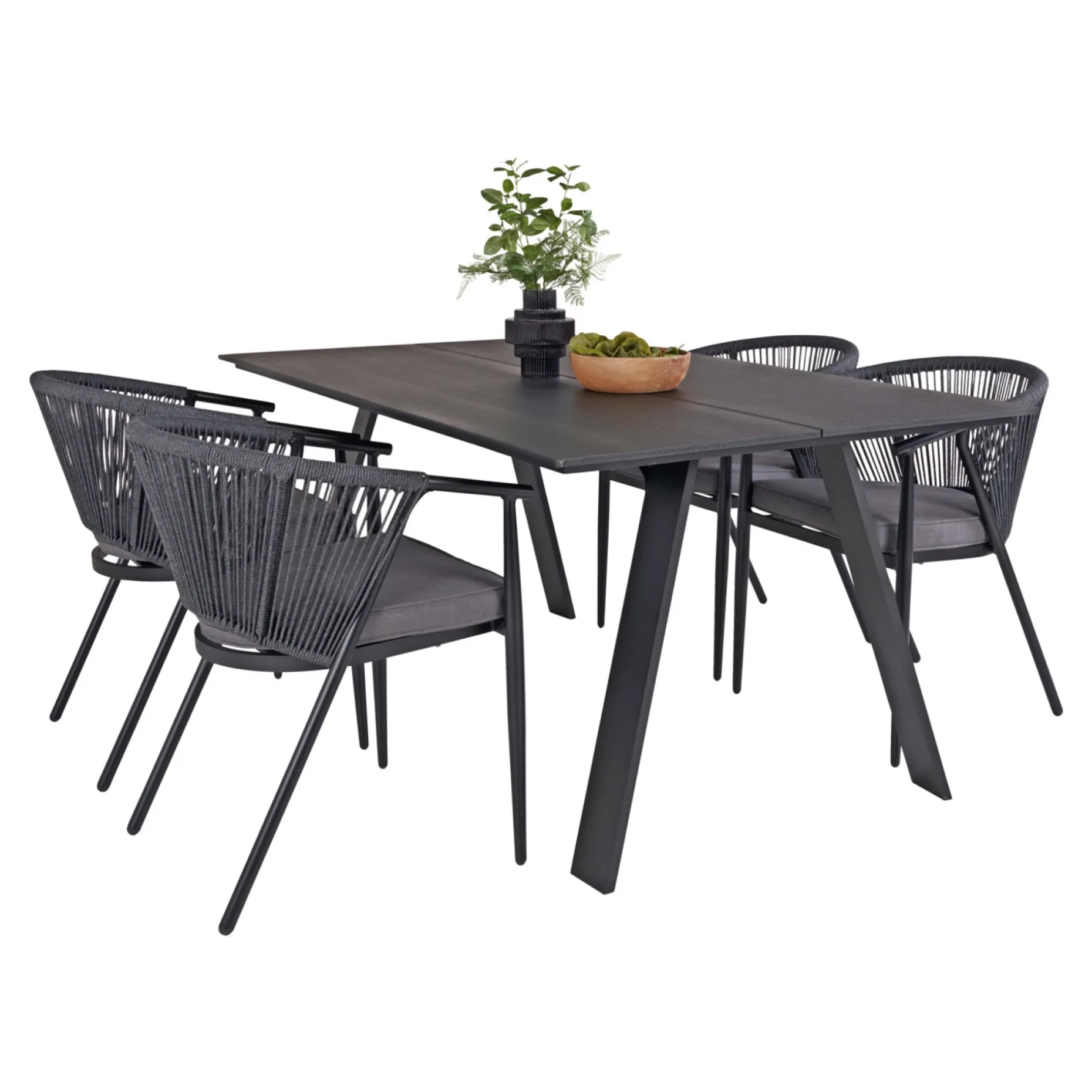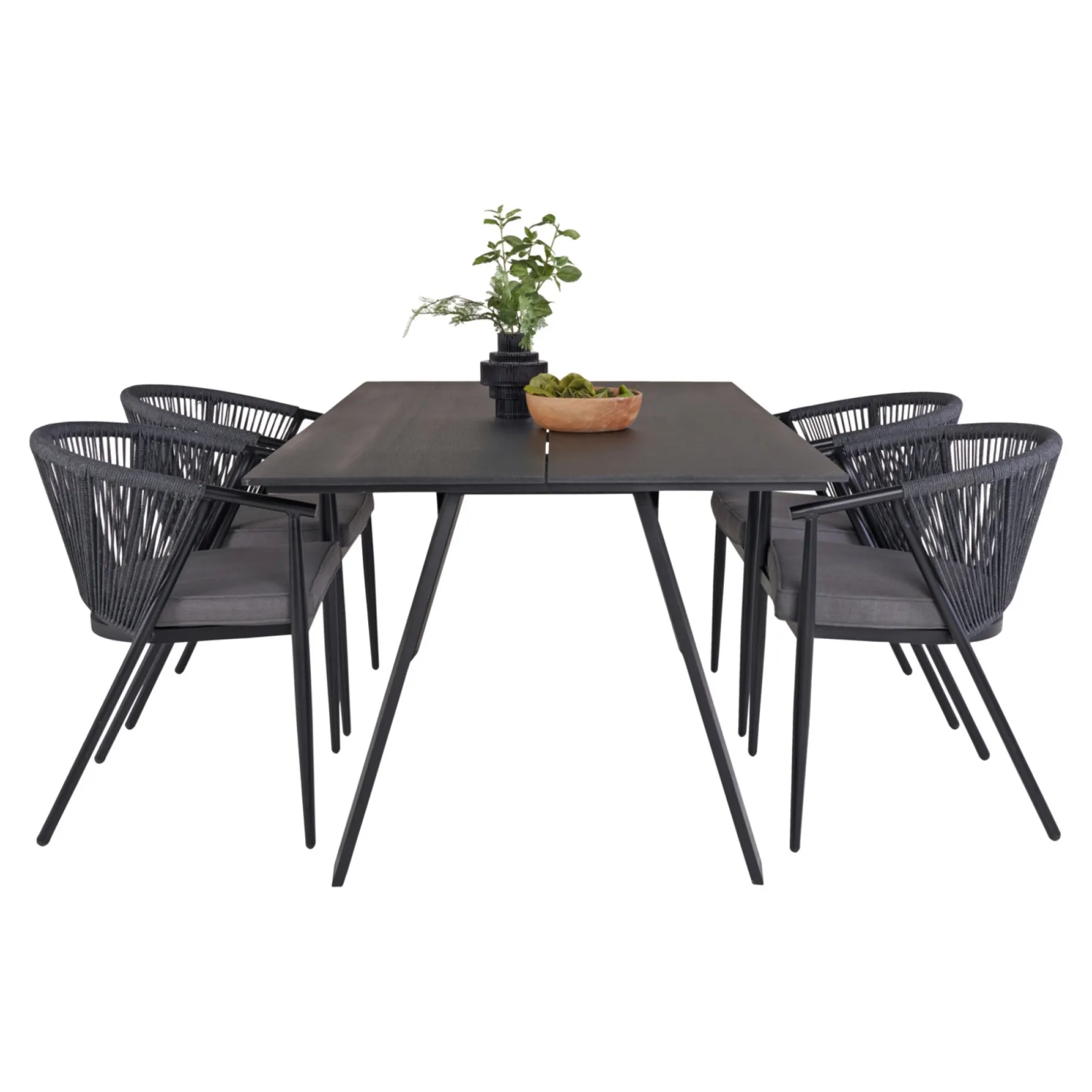 Plankebord L165xB100xH74 cm med sort nonwood bordplade og alustel. Hertil 4 Como stabelbare stole med antracitgrå rebflet og alustel. Inkl. hynder.