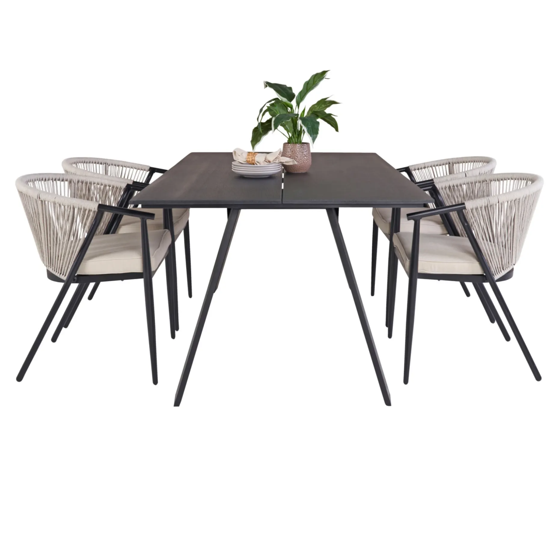 Plankebord L165xB100xH74 cm med sort nonwood bordplade og alustel. Hertil 4 Como stabelbare stole med lys sand rebflet og alustel. Inkl. hynder.