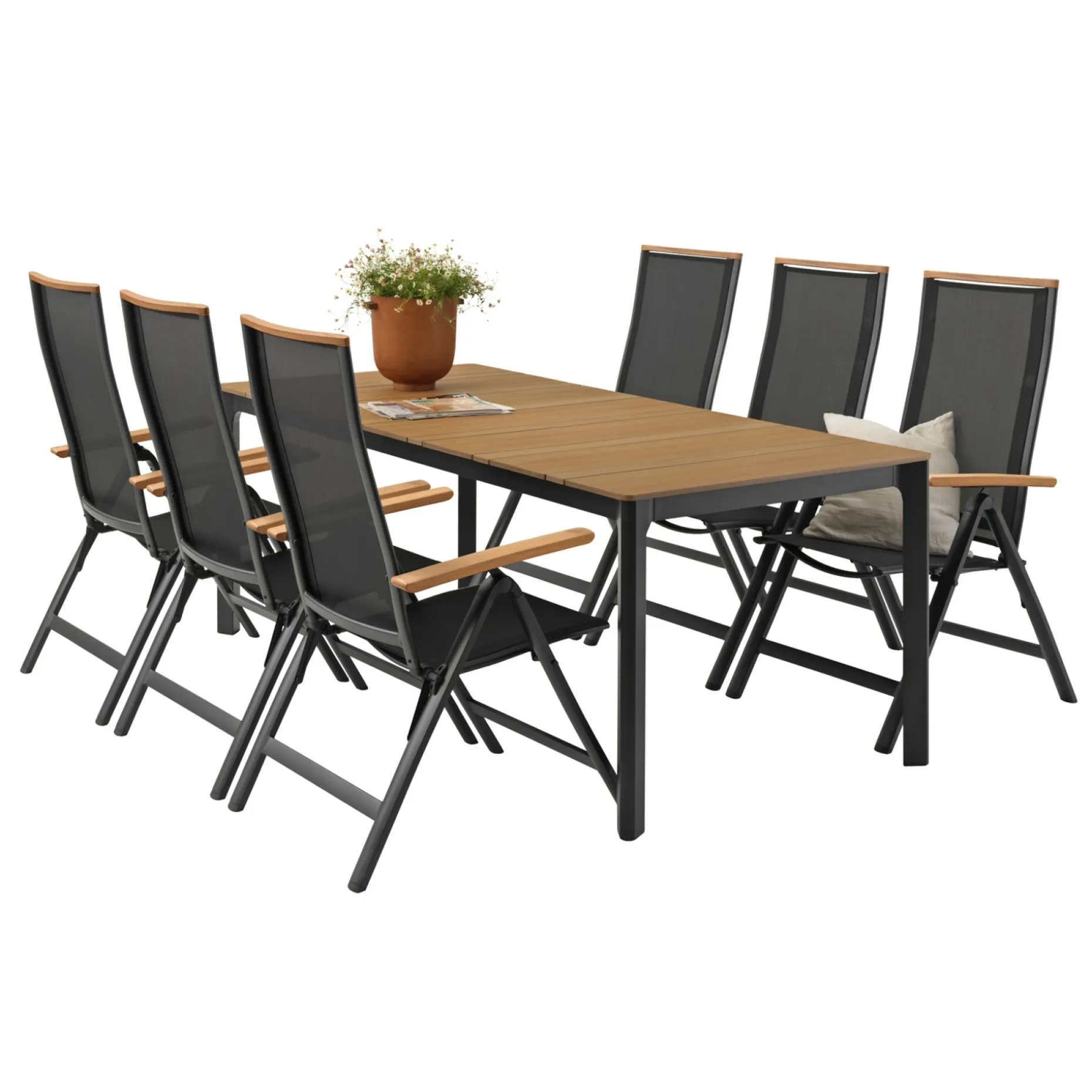 Bord L199xB90 cm med bordplade i naturfarvet nonwood og sort pulverlakeret alustel. Sættet indeholder 6 Faro positionsstole i sort texteline med armlæn og top på ryglæn i aluminium.