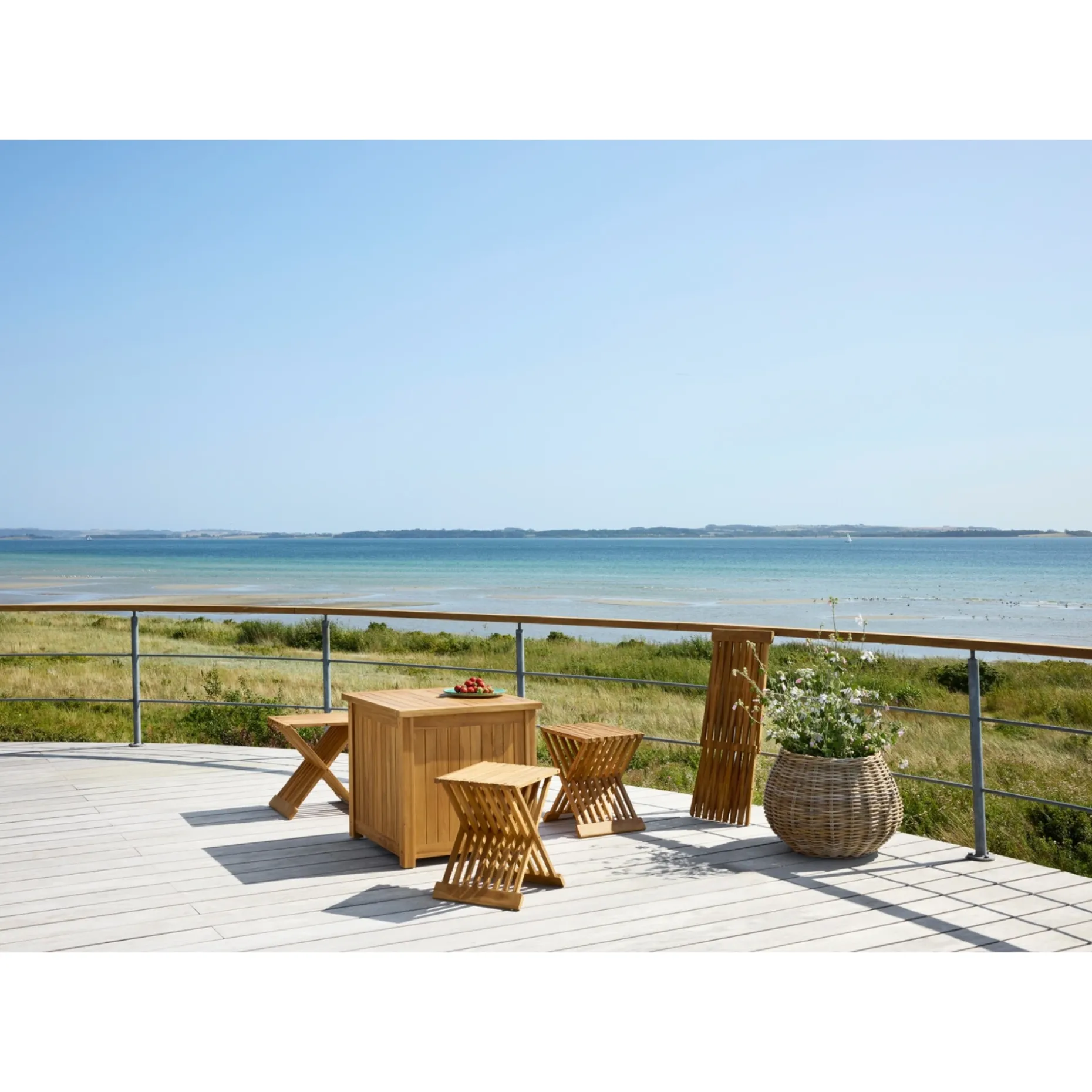 Produktet er udført i FLEGT-Certificeret teaktræ, der giver en varm og naturlig overflade samt god holdbarhed ved udendørs brug. Teakets struktur bidrager til et enkelt og tidløst udtryk, der passer til mange udeområder.