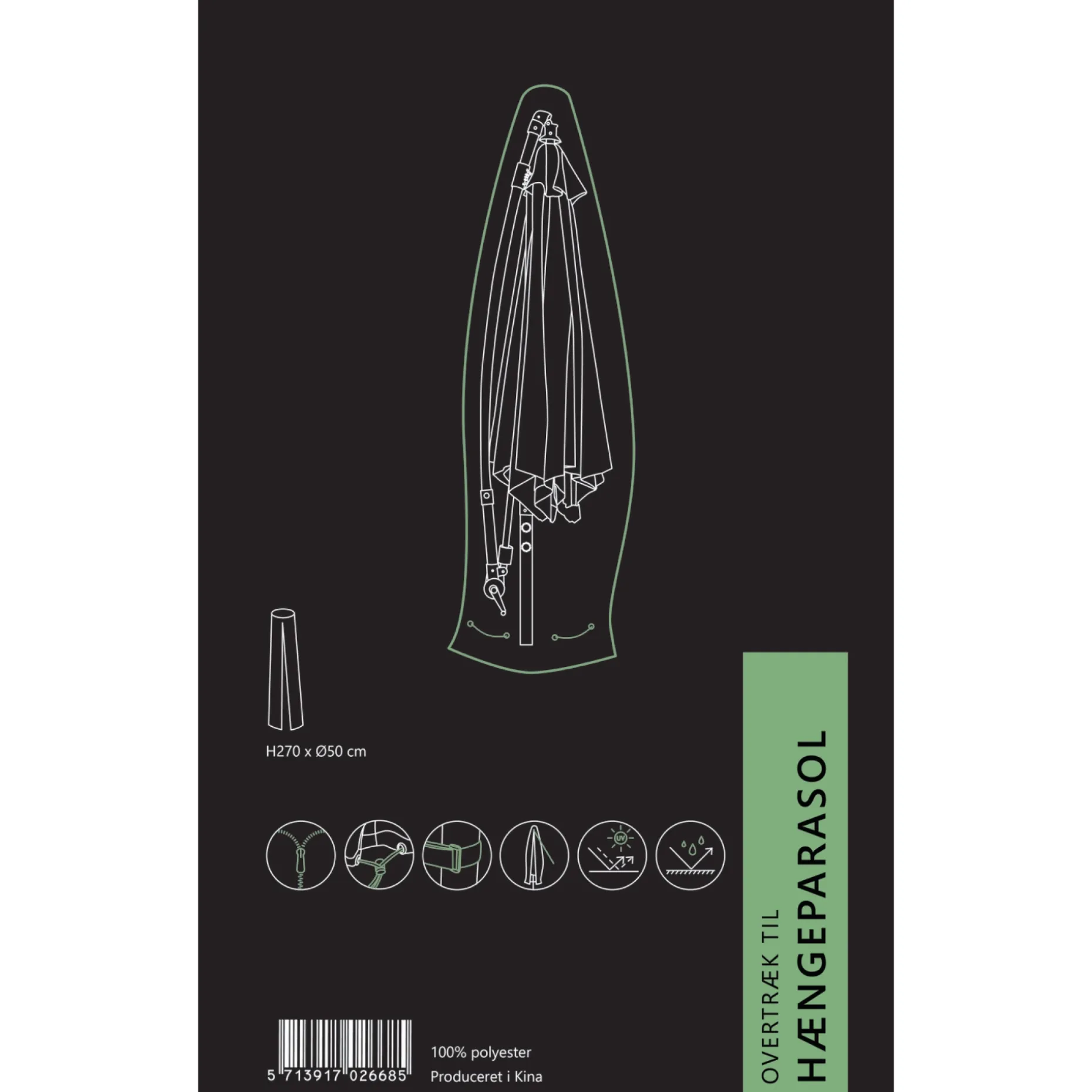 Betrækket er behandlet med polyurethan (PU coated), så vand ikke så let trænger ind til din parasol. Desuden er det åndbart. Outrium overtrækket er sort og kommer i en praktisk opbevaringstaske med håndtag.
