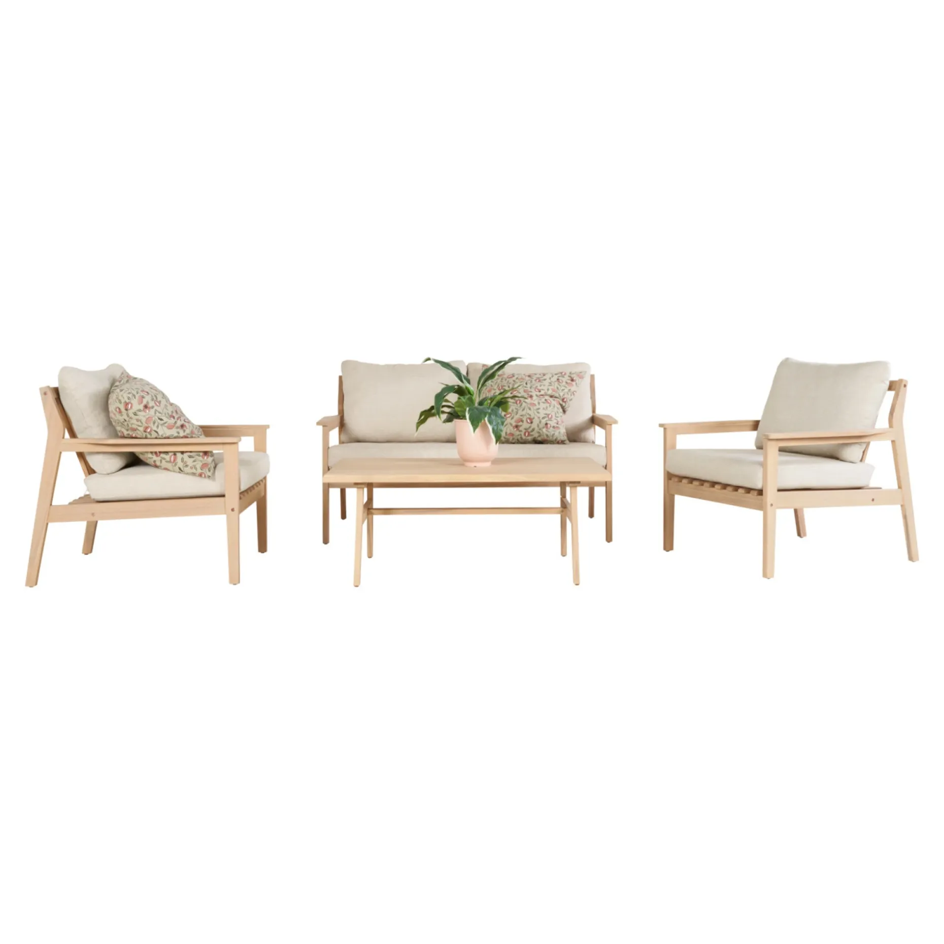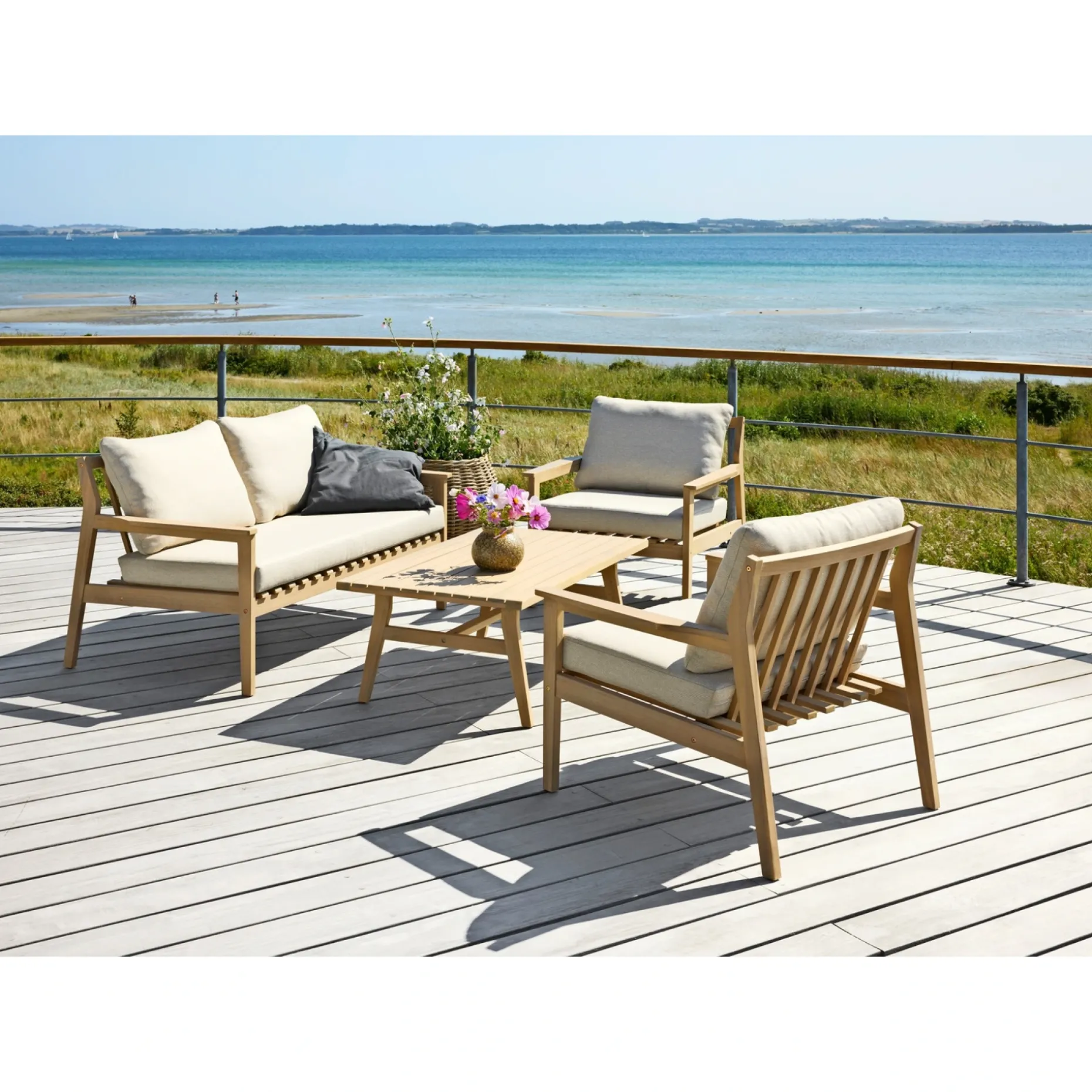 Hanoi sofasæt i akacietræ leveres inkl. hynder. Sættet indeholder en 2-pers. sofa, to stole og et bord, som tilsammen udgør en komplet siddegruppe. Hynderne medfølger og øger komforten ved længere ophold.