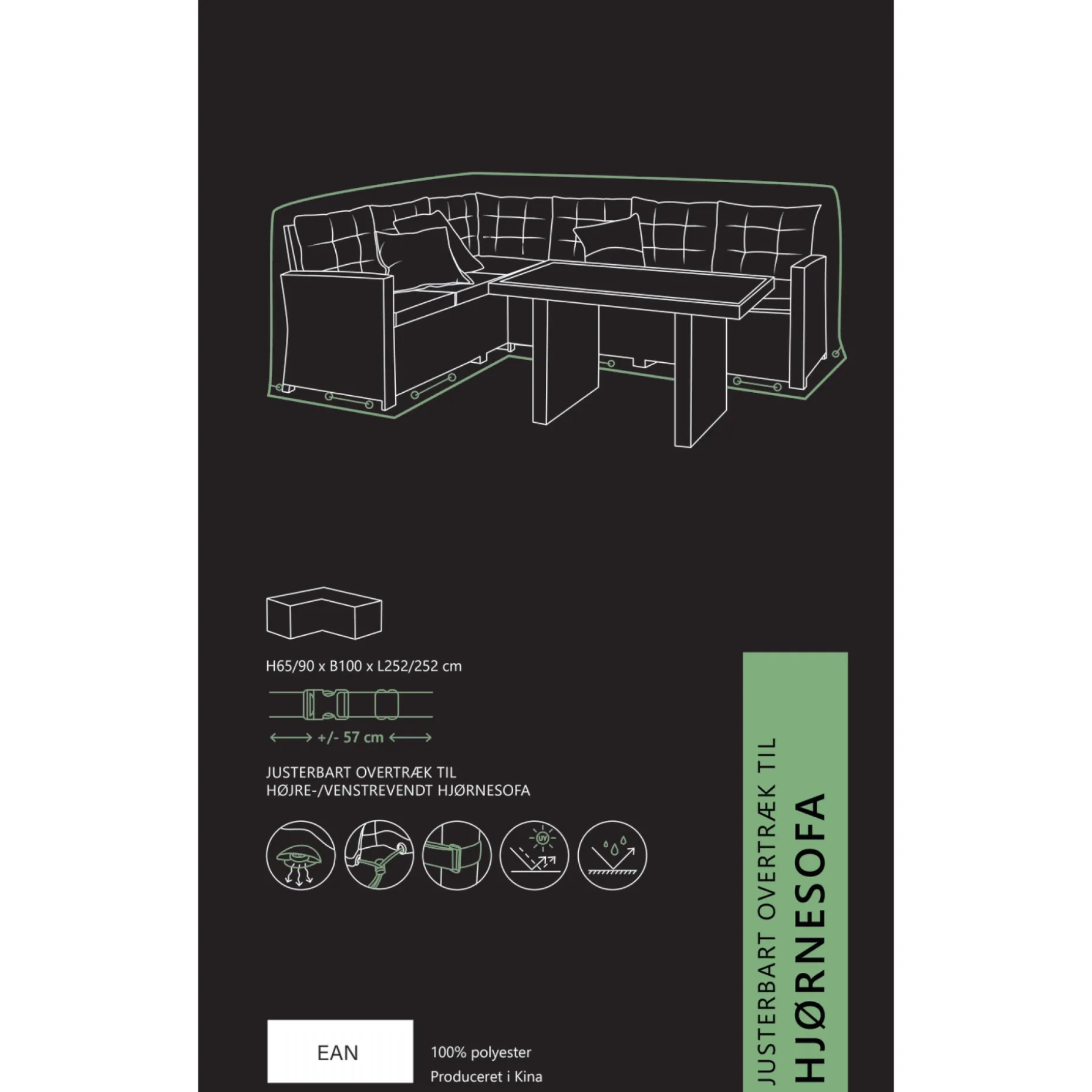 Overtrækket er justérbart i begge sider, så det passer både til højre- og enstrevendte hjørnesofaer. Kan justeres 57 cm pr. side fra 195cm til 252cm.