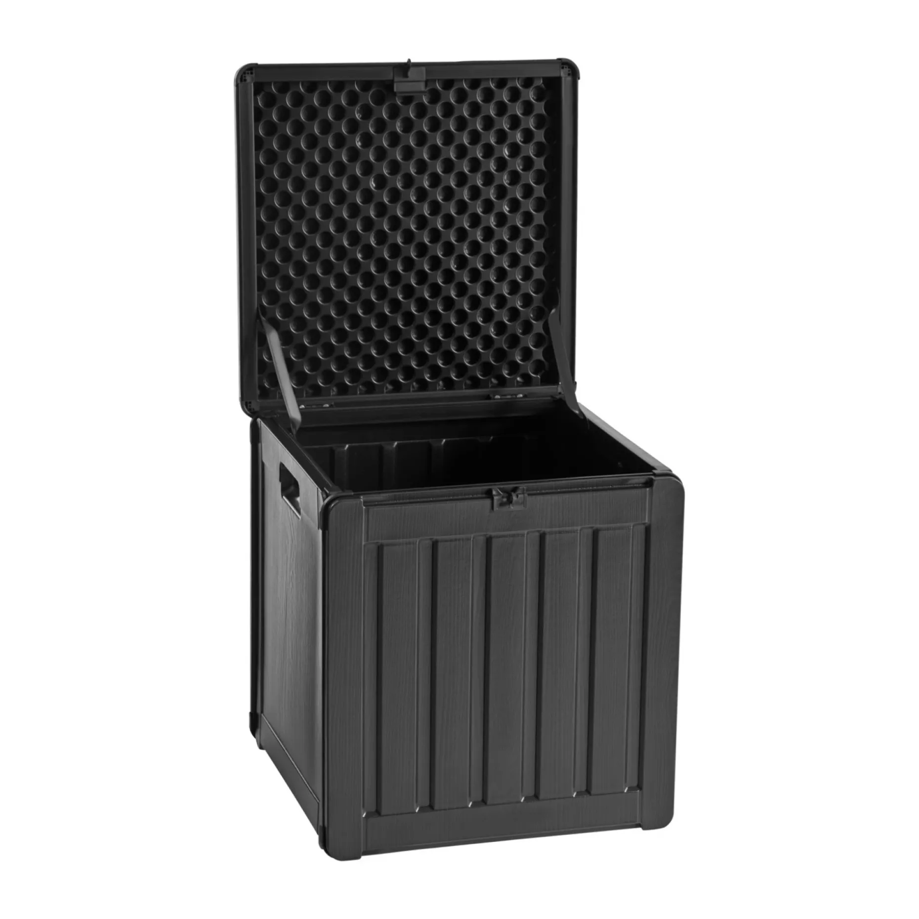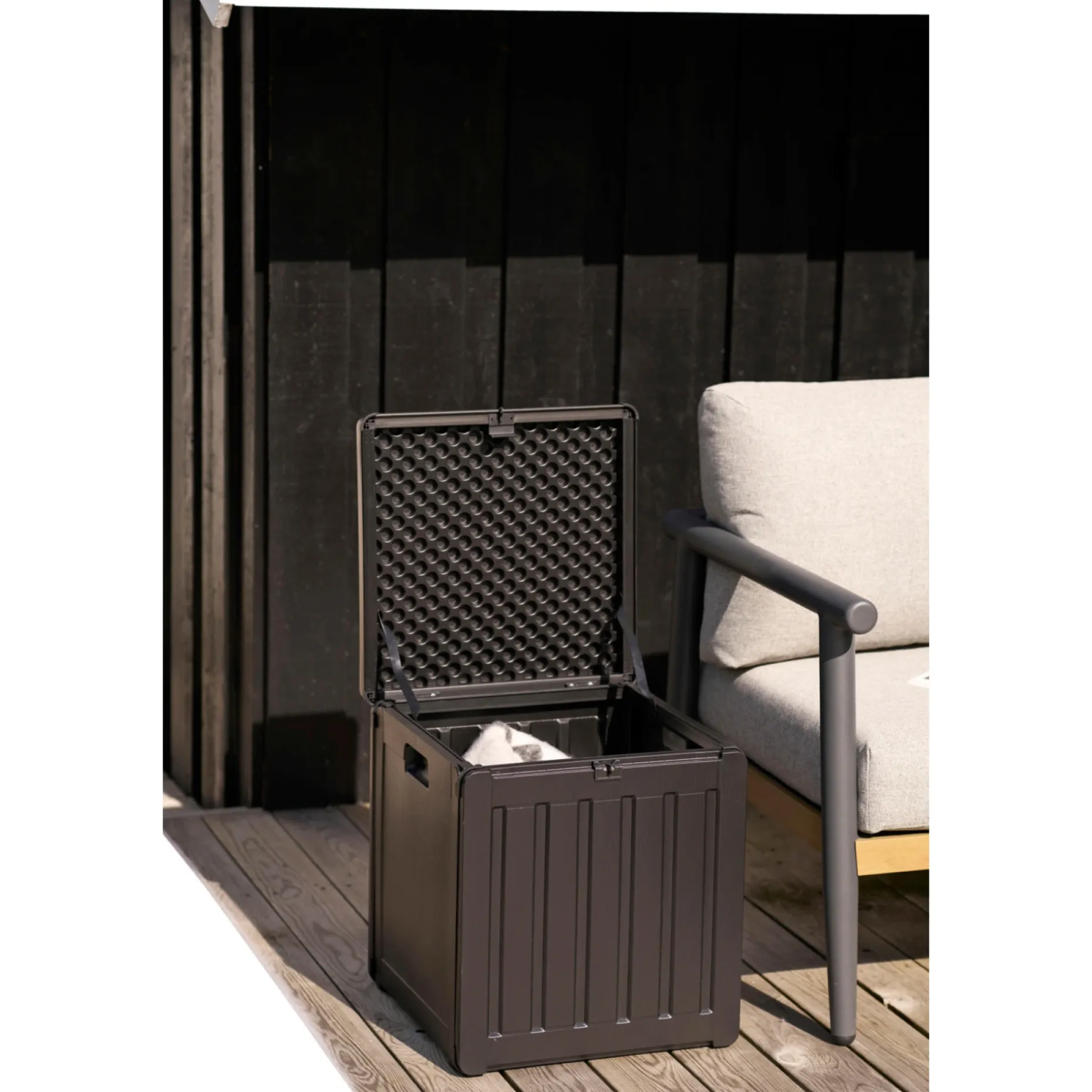 Til opbevaring af f.eks. legetøj på terrassen.