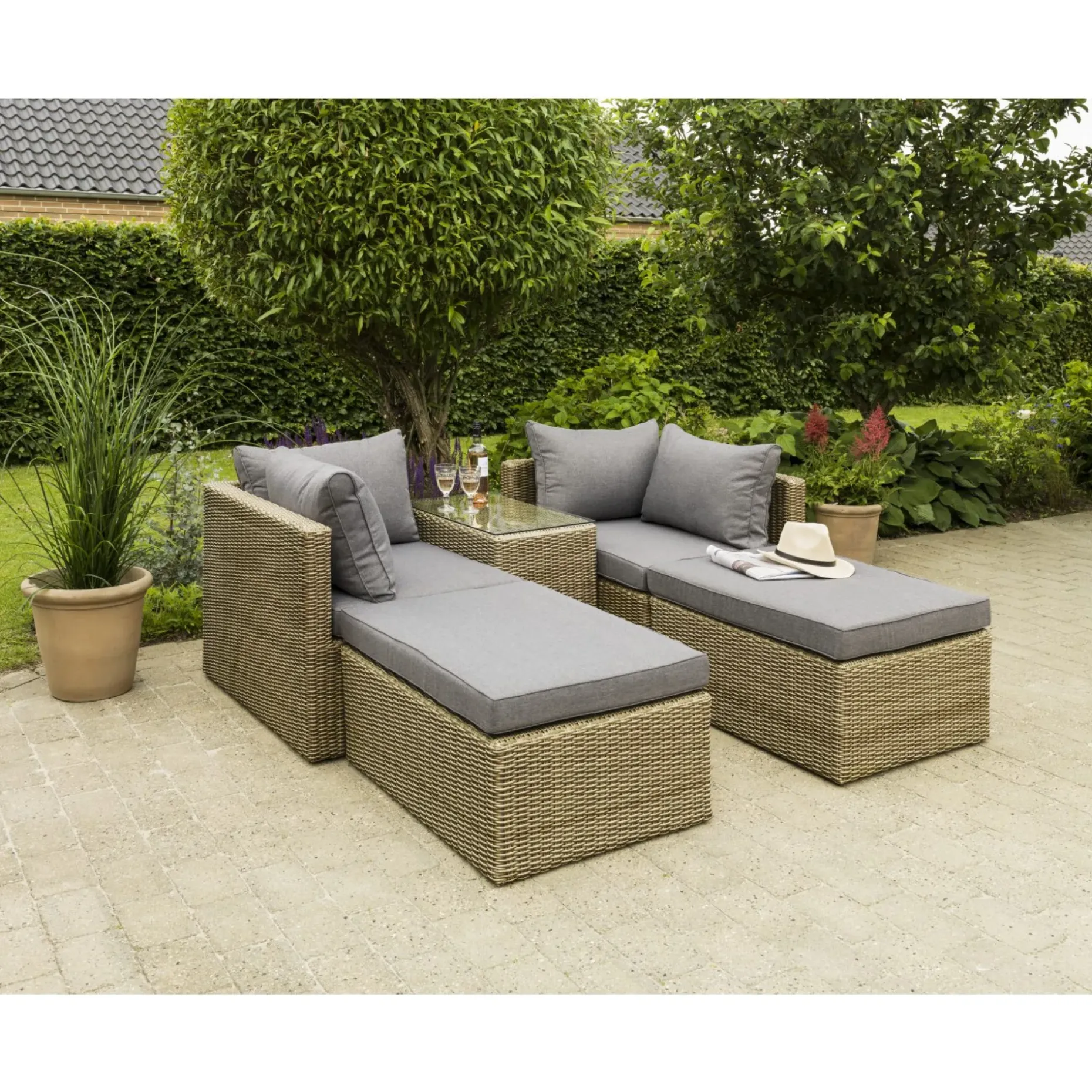 Multi loungesæt i kubofarvet PE-flet med mange kombinationsmuligheder.