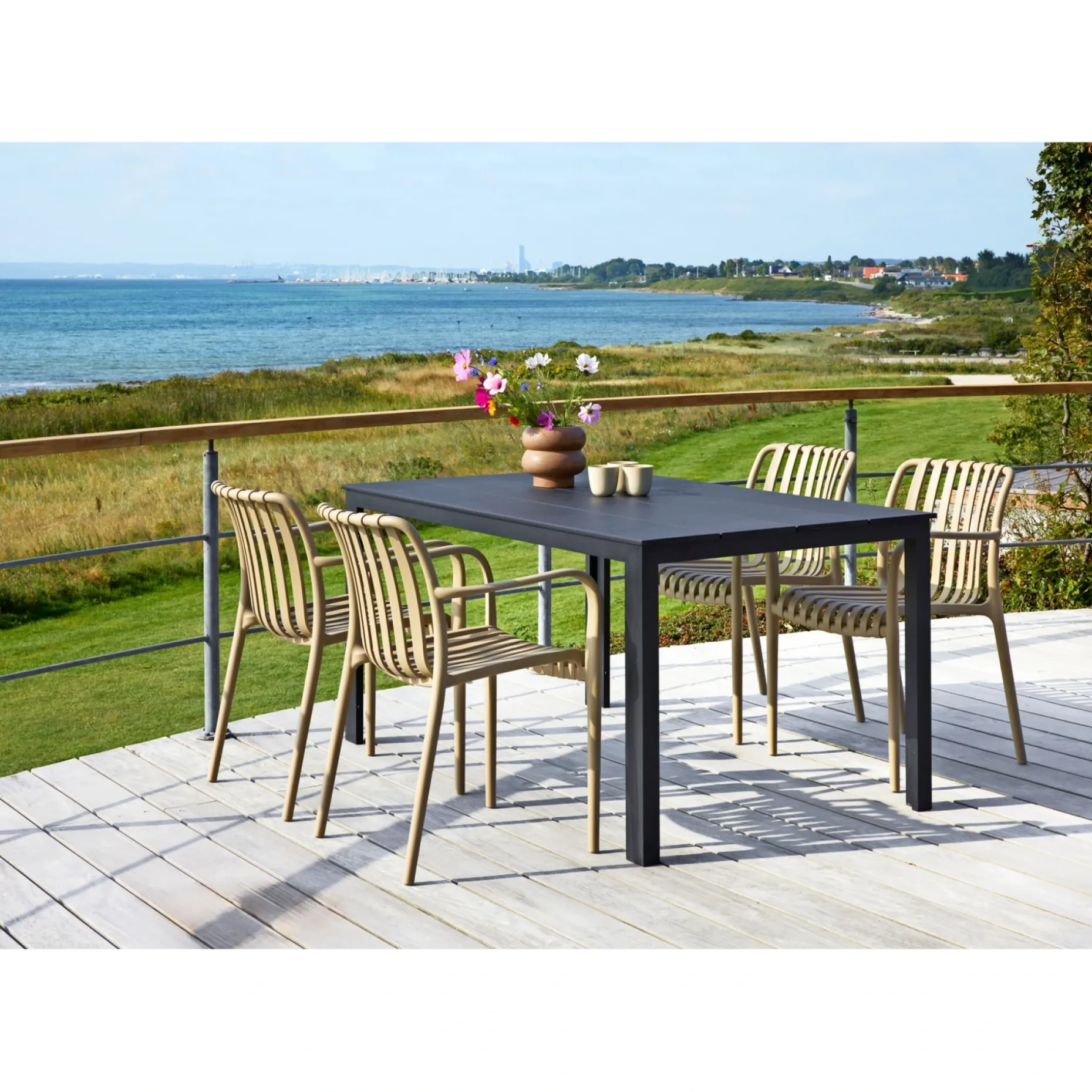 Hertil 4 stabelbare stole i sandgrå plast. Kan stables.
