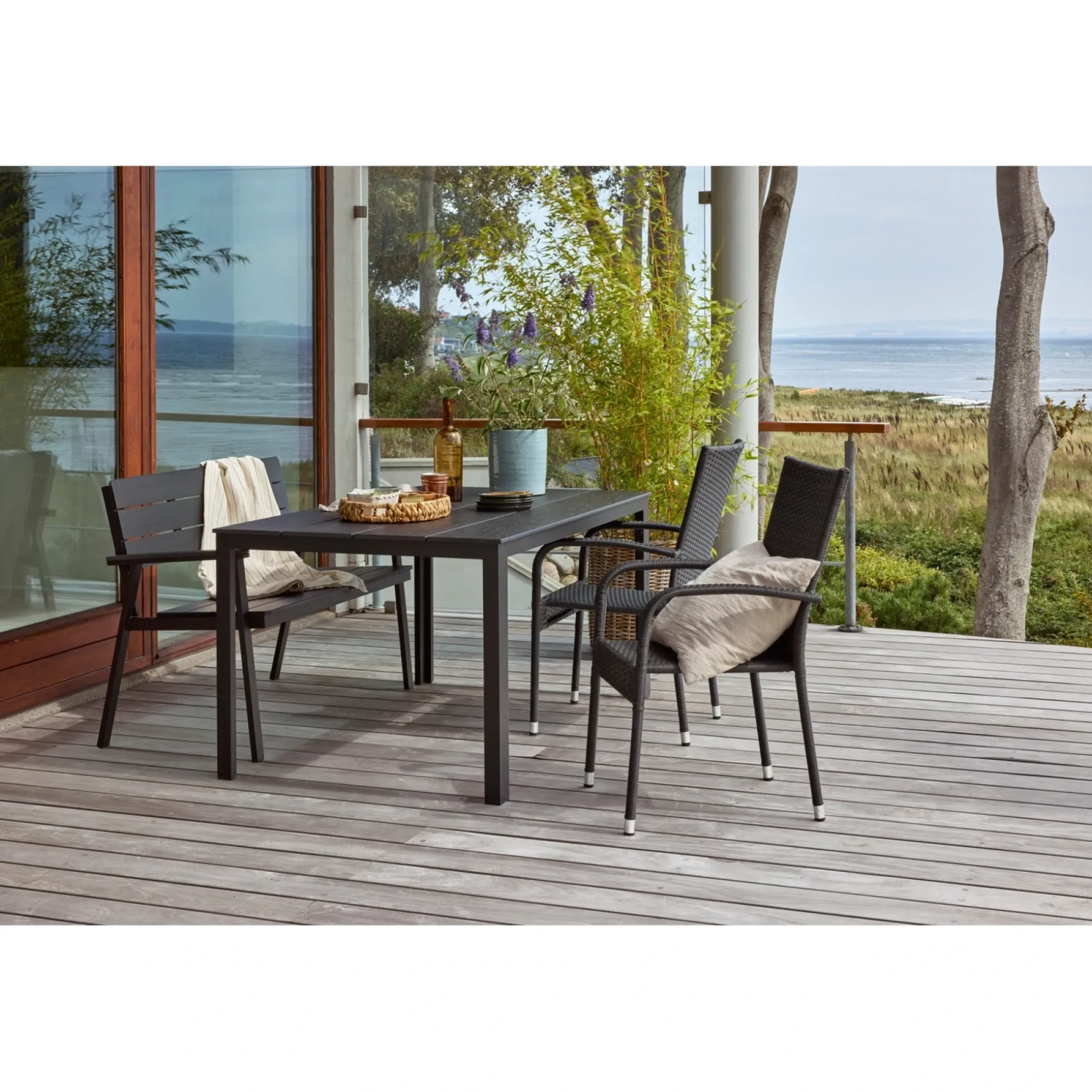 Hertil 2 Napoli stabelbare stole i sort børstet PE-flet og 1 Korfu bænk L117 cm i sort nonwood og alustel.