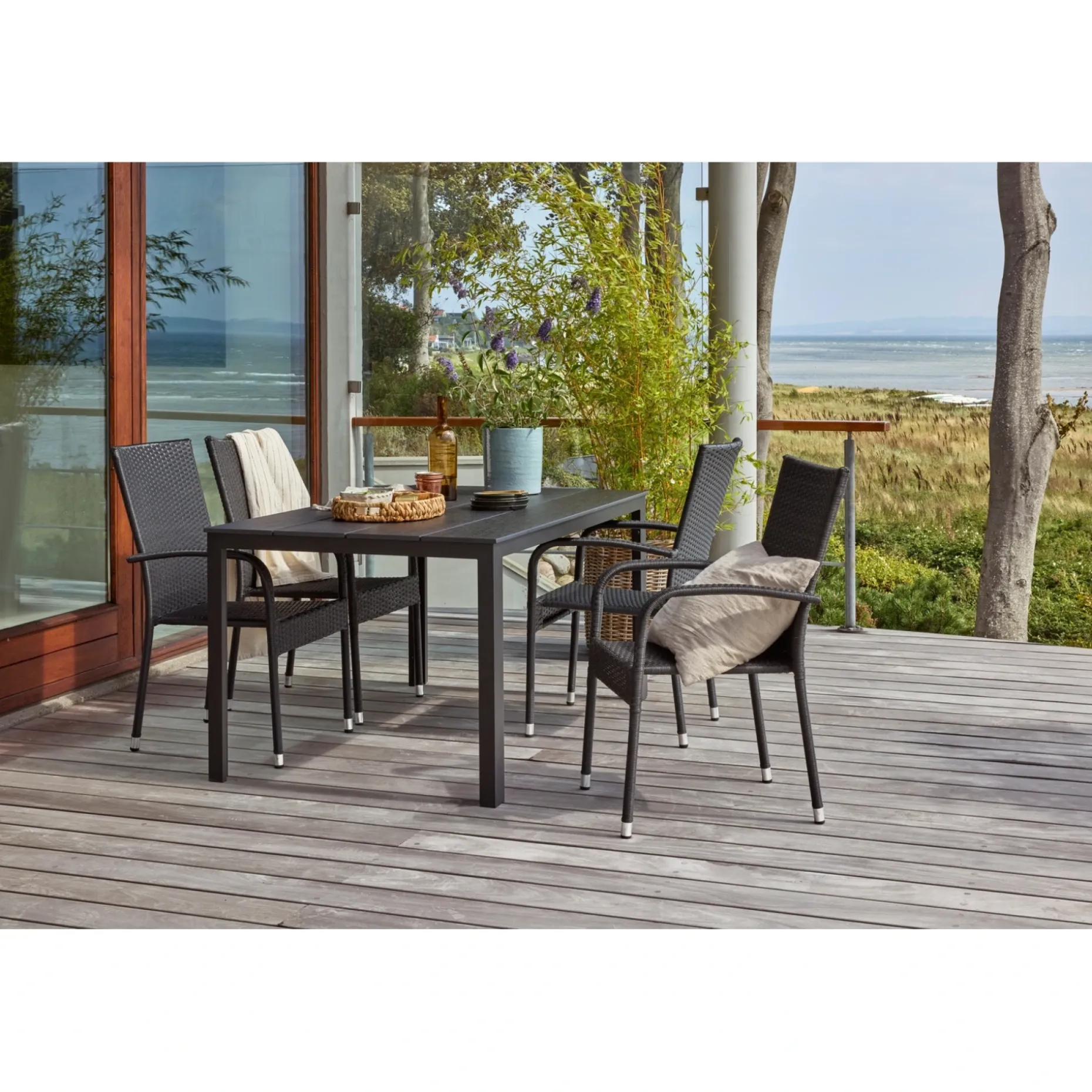 Pisa bord 90×150 cm med bordplade i sort nonwood og antracit alustel. Hertil 4 Napoli stabelbare stole i sort børstet PE-flet.