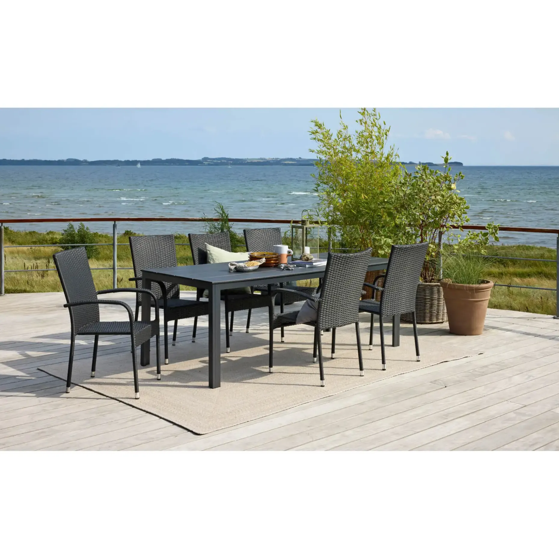 Pisa bord 90×205 cm med bordplade i sort nonwood og antracit alustel. Hertil 6 Napoli stabelbare stole i sort børstet PE-flet.