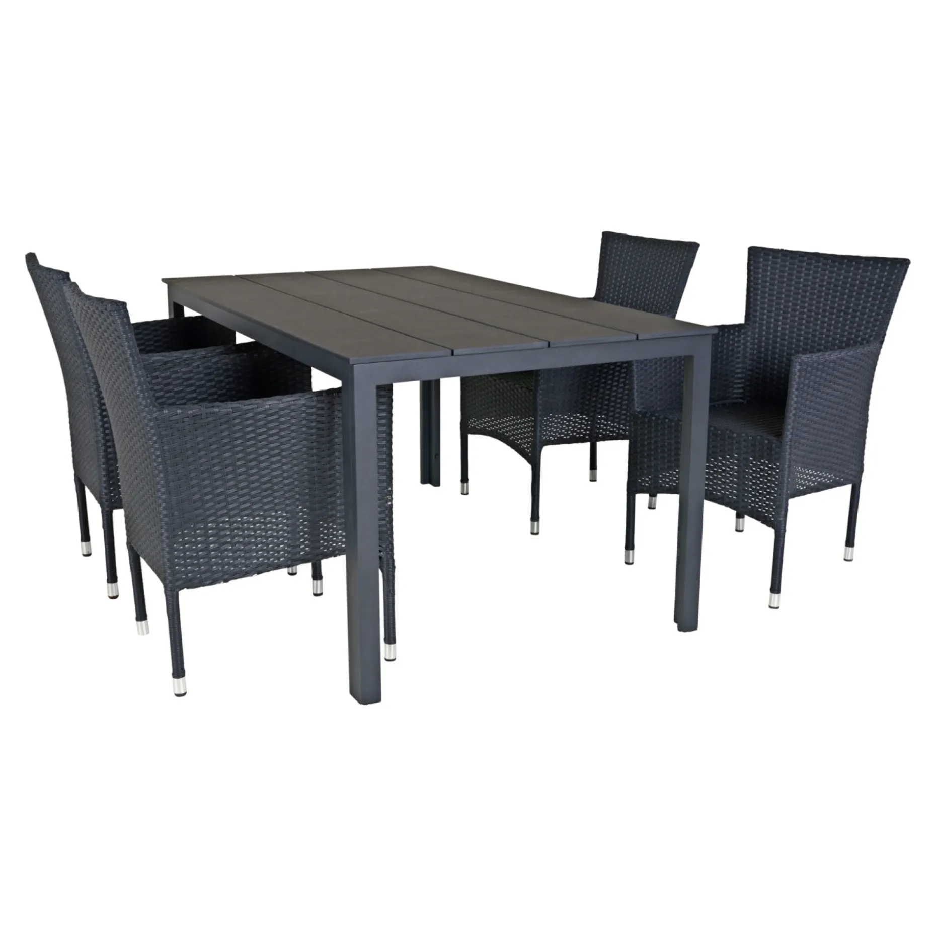Pisa bord 90×150 cm med bordplade i sort nonwood og antracit alustel. Hertil 4 Toscana stabelbare stole i sort børstet PE-flet. Ekskl. hynder.