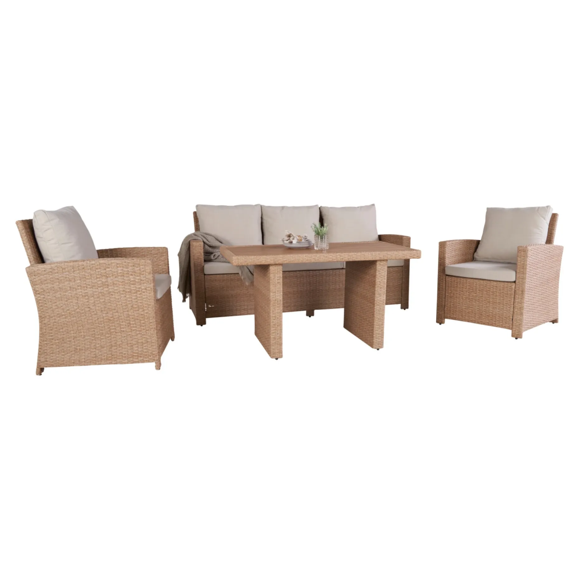 Sofasættet består af en 3 personers sofa, to stole og et højt bord med nonwood top. Sofasættet har en lang udendørs levetid og kræver meget lidt pleje.