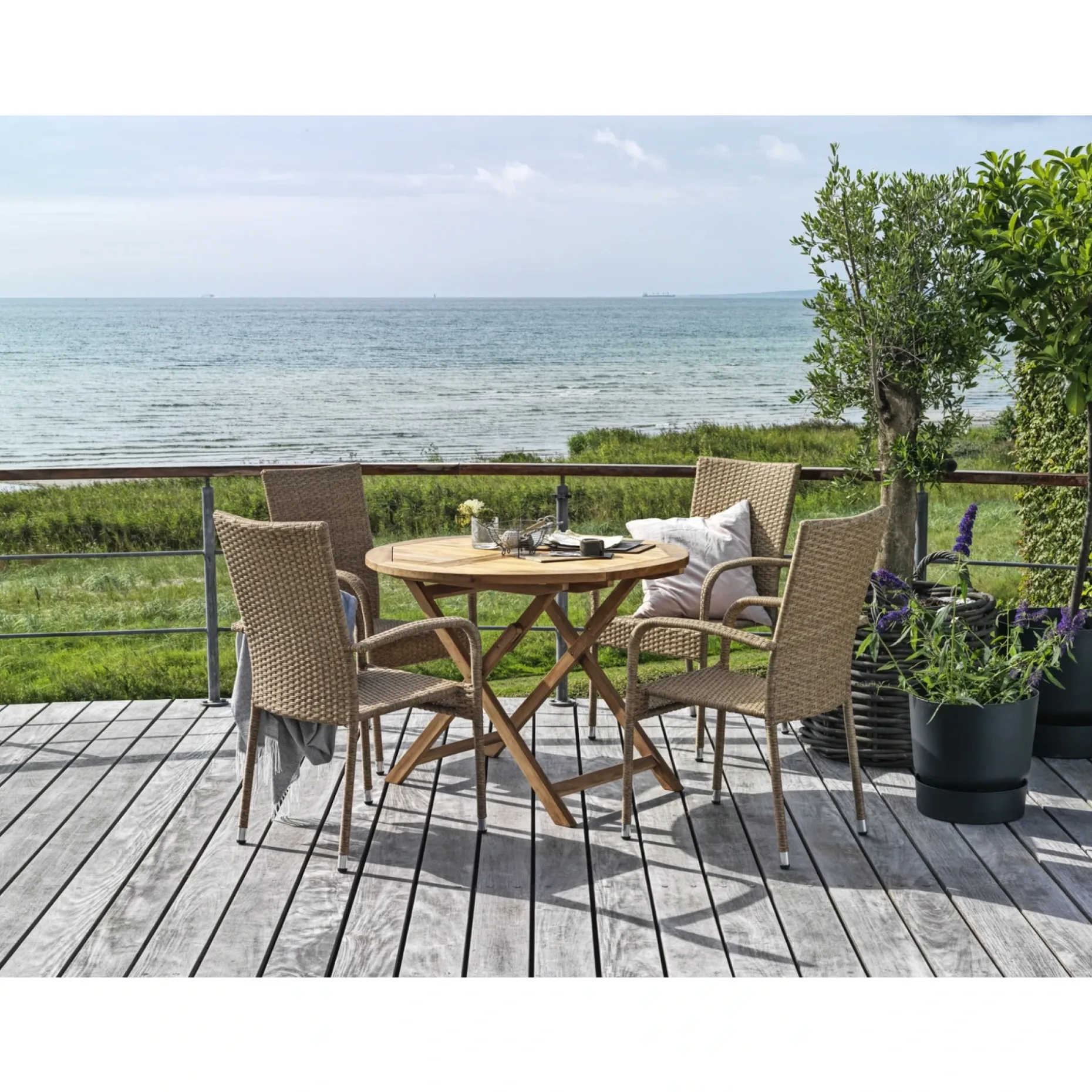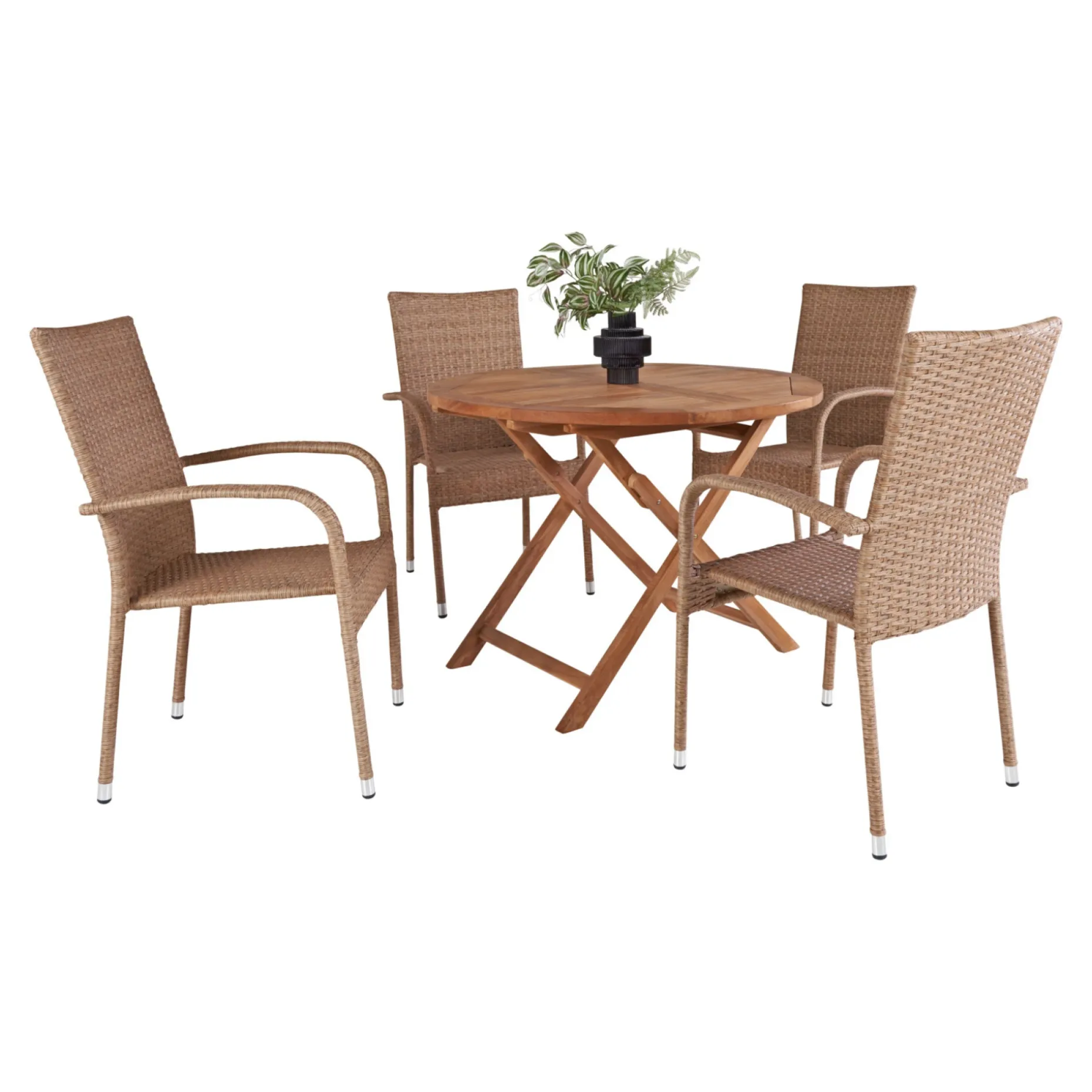 Bord Ø100 cm i teak. Kan foldes sammen. Hertil 4 Napoli stabelbare stole i naturfarvet PE-flet.