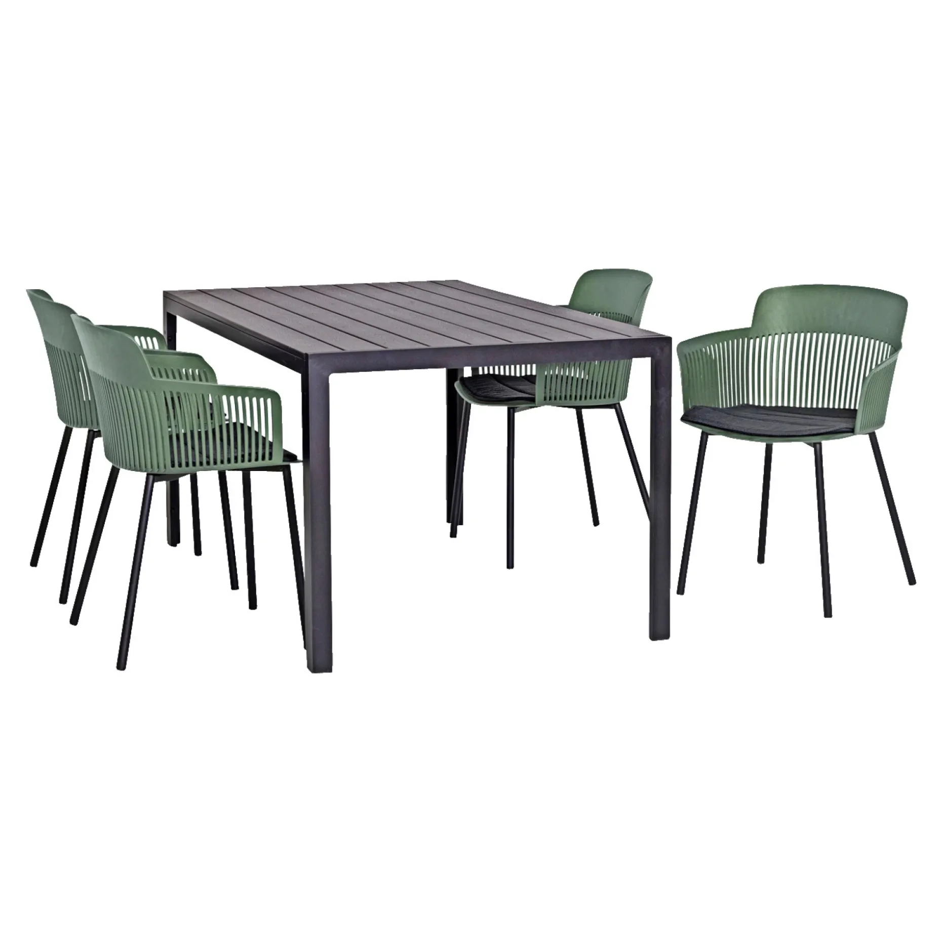 Toscana bord 90×150 cm i sort nonwood og alustel. Hertil 4 Lagos stole i grøn plast med sorte stålben.