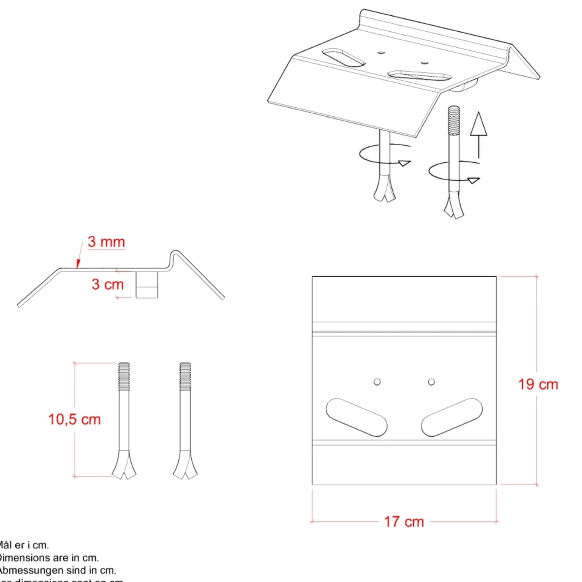 Kombinationen af målene 19 cm og 17 cm gør det muligt at matche pladen med almindelige stolpedimensioner. Anslagspladen kan fungere sammen med skudrigel for at skabe en komplet og stabil lågefunktion. Produktets oplysninger inkluderer dimensioner og tilbehørsnummer for nem bestilling.