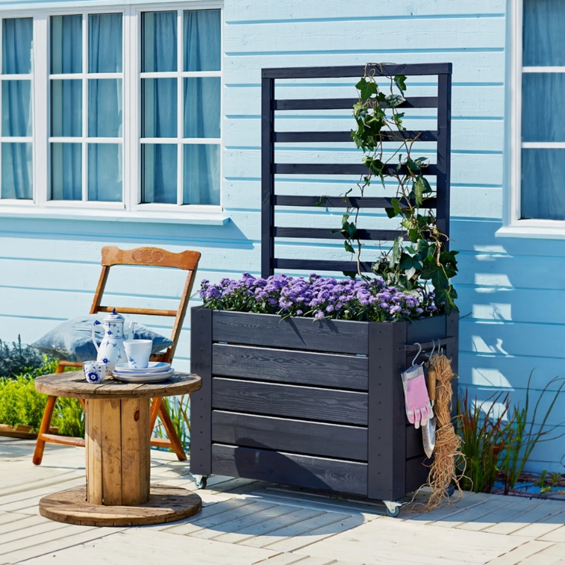 Blomsterkassen er udført med hjul, så den er nem at flytte, og espalieret giver plads til klatreplanter eller opbinding.