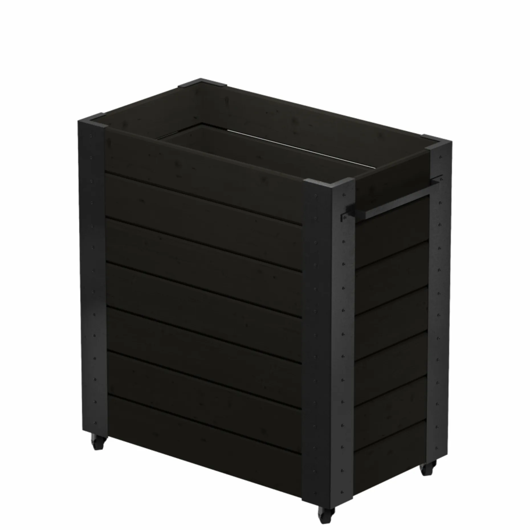 Med målene 95 x 50 x 87 cm giver den plads til krydderurter, grøntsager og blomster, og den er designet til at være overskuelig for både nybegyndere og erfarne gør-det-selv’ere. Kassen står i sort RAL9005 og leveres med hjul, så den er nem at flytte efter sol og skygge.