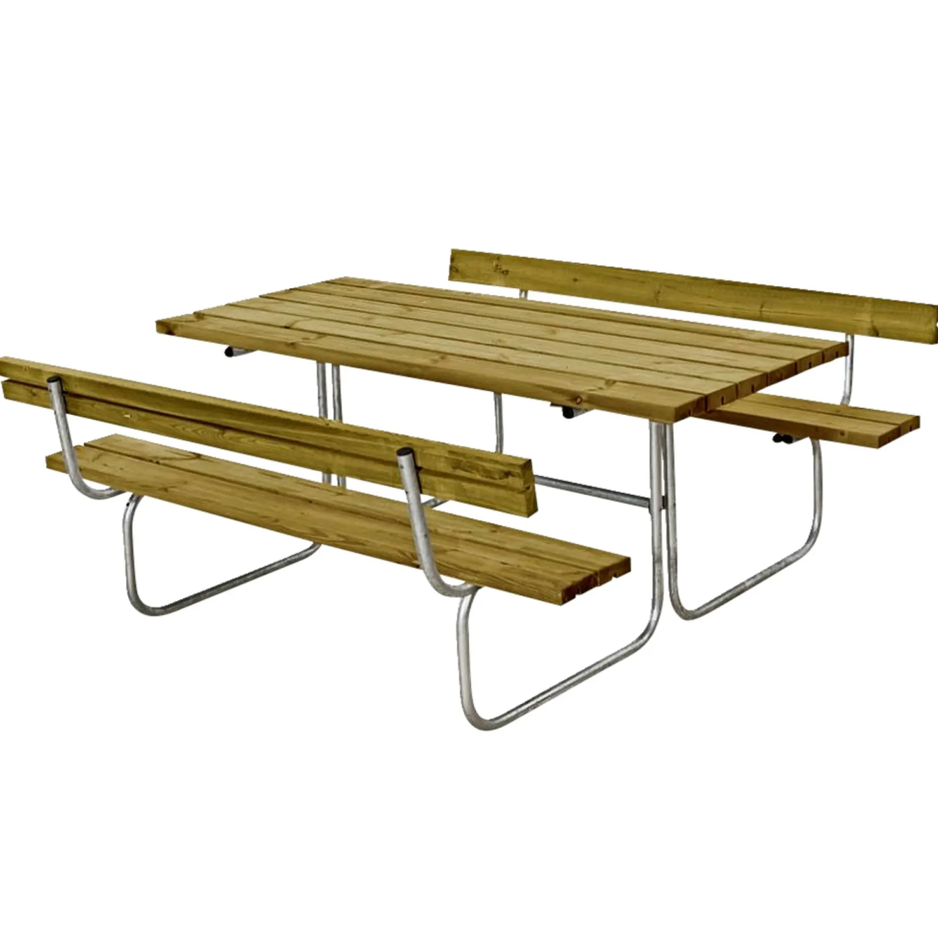 PLUS CLASSIC BORDBÆNKESÆT NATURClassic Bord/Bænkesæt m/2 ryglæn – 177 cm – TrykimprægneretVarenr. består af:1 stk. bord/bænksæt og 2 stk. ryglæn inkl. beslag.Planker:42×116 mm trykimprægneret nåletræ.Bordplade:Længde 177 cm – bredde 78 cm – højde 73 cm.Bænke:Længde 177 cm – bredde 25 cm – højde 44 cm.Ryghøjde 75 cm.Siddepladser: 6 (3 pr. bænk).Stel/ben:Ø32 mm varmgalvaniseret stål.Leveres som “Saml selv”.Trykimprægneret klasse A/B