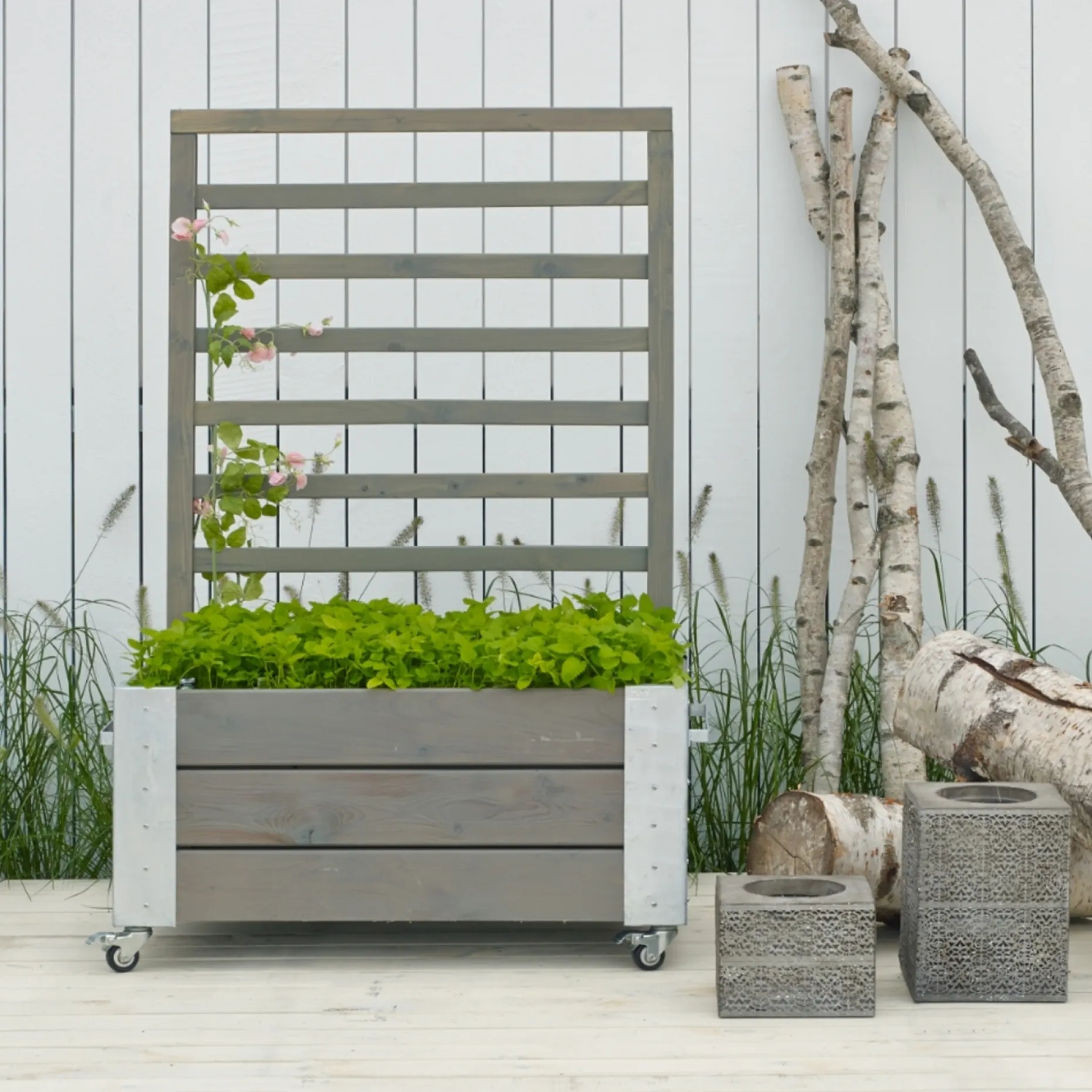 PLUS Cubic blomsterkasse med espalier og hjul er designet til fleksibel placering og høj funktionalitet.