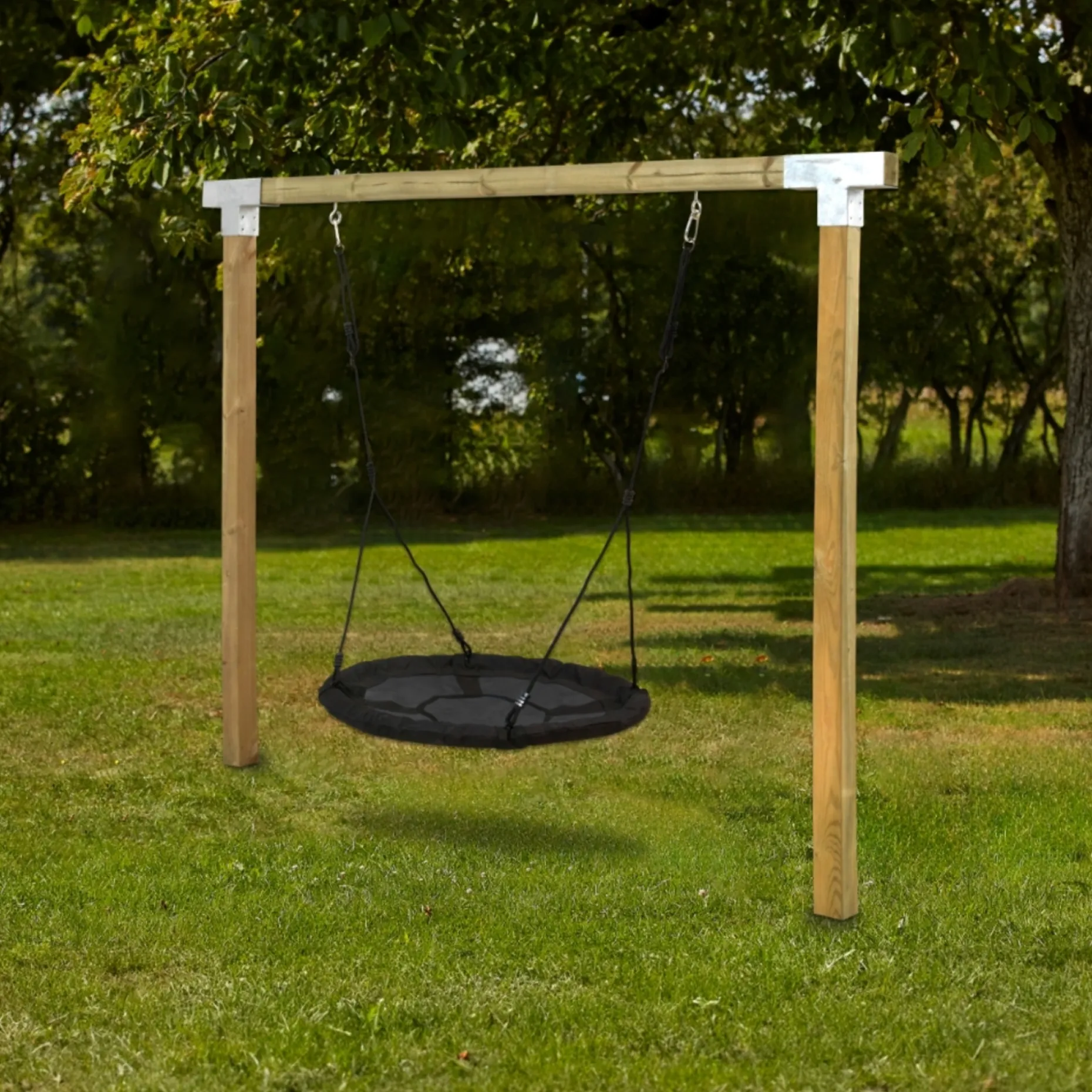 PLUS Cubic Gyngestativ leveres inkl. rund redegynge og alt nødvendigt til montage. Sættet består af stolper, overligger, 2 Cubic samlebeslag med skruer samt redegynge med karabinophæng. Konstruktionen er beregnet til udendørs leg og giver et sikkert sted til gyngeaktivitet.Stolperne er omlimede træstolper 9×9×298 cm til nedstøbning, og overliggeren er en omlimet træstolpe 9×9×268 cm med huller til karabinhager. Alle trædele er trykimprægneret og klassificeret som Trykimprægneret NTR klasse A. Cubic beslag er i varmgalvaniseret stål.Redegynge er rund Ø98 cm i sort/blå og leveres inkl. 2 karabinhager. I denne konstruktion anbefales en maksimal belastning på 150 kg. Der er plads til én redegynge eller to gyngesæder.Gyngestativet leveres som “Saml selv” og giver aktiv leg, røde kinder og træning af motorik for de små. Saml selv-løsningen og inkluderingen af samlebeslag og skruer gør montage enkel for gør-det-selv’eren.