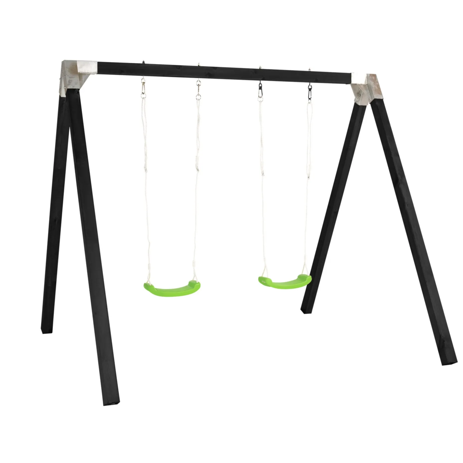 PLUS Gyngestativ 5 sort er et komplet luksus-sæt inklusive to grønne gyngesæder, designet til familier der ønsker solid leg og lang levetid. Konstruktionen består af omlimede træstolper og en omlimet overligger, begge trykimprægneret og grundmalet for øget holdbarhed. Overliggeren har huller til karabinhager, så gyngerne hænger sikkert. Stativet leveres som saml selv og giver plads til to enkeltgynger eller én redegynge, hvilket gør det fleksibelt til forskellige legebehov. Gyngesæderne er i plast og tåler en belastning på 70 kg pr. sæde. Alle nødvendige beslag, skruer, 4 karabinhager og jordankre medfølger, så du kan samle og fastgøre stativet i haven. Jordankrenes længde på 52 cm sikrer god forankring i jorden ved korrekt montering. De varmgalvaniserede Cubic samlebeslag og jordankrene mindsker risiko for korrosion, og det trykimprægnerede træ med grundmaling forlænger træets holdbarhed. Med gyngestativet får børnene aktiv leg, røde kinder og træning af motorik.