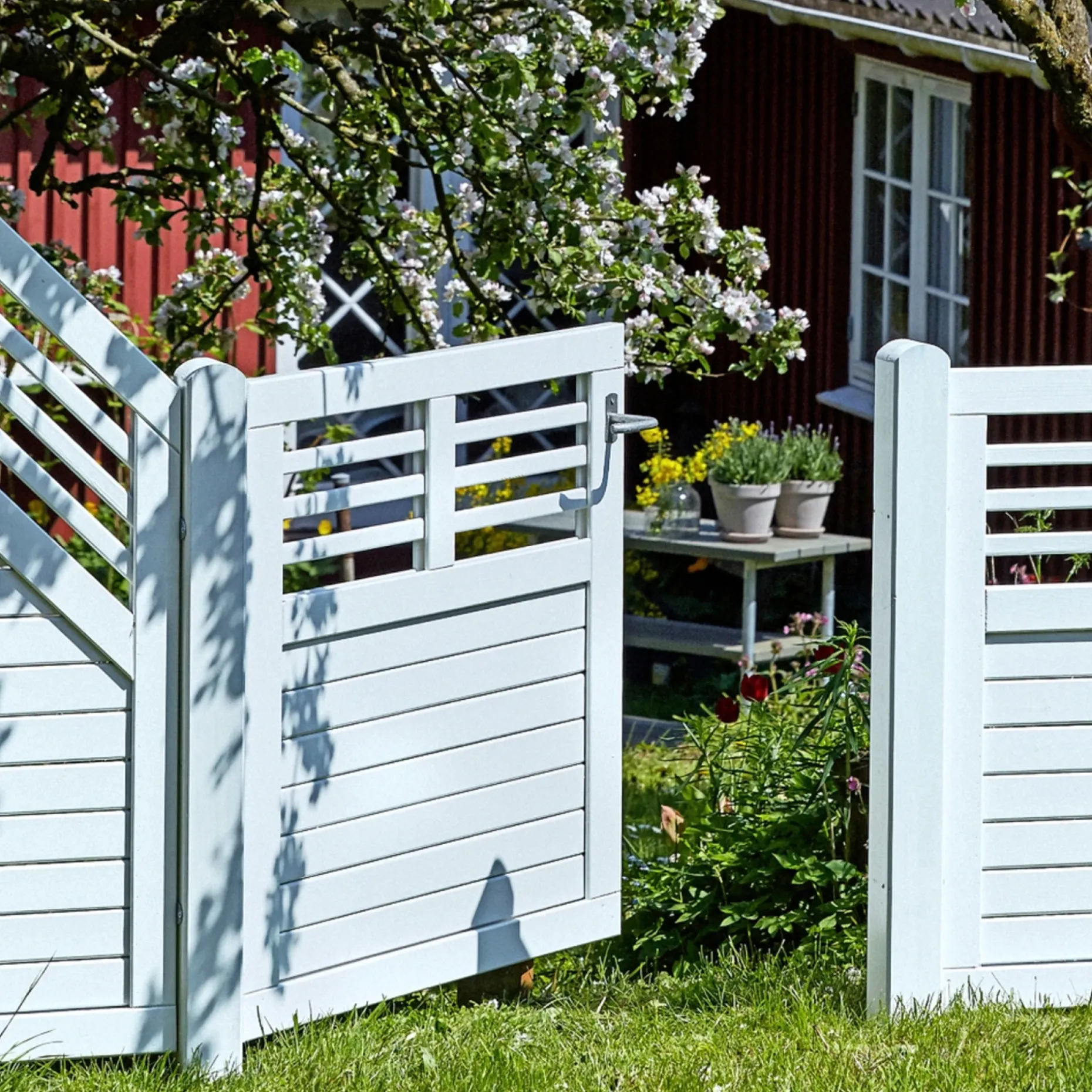 Decora-løsningen opfylder behovet for læ og privatliv uden helt at lukke af; espalieret i toppen lader lys og udsyn spille sammen med afskærmning. Kombiner lågen med skrå og vandrette hegnselementer i hvid eller sort for en afbalanceret helhed, der supplerer omgivelser og landskab.