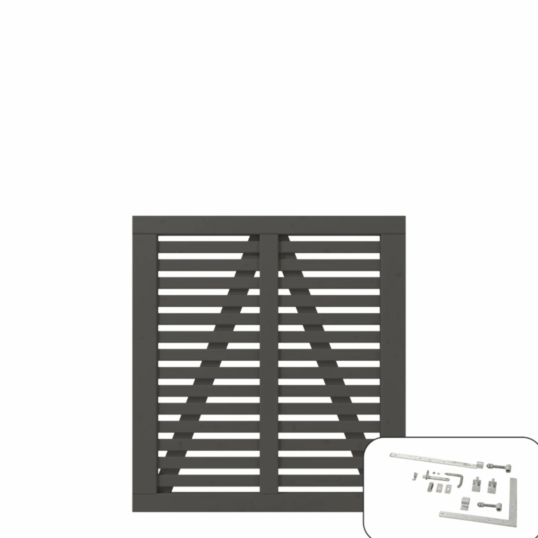 Designet fremhæver både funktion og æstetik: listernes samspil mellem lodrette og vandrette elementer giver et let, struktureret indtryk, der passer til et roligt uderum. Inkluderede beslag gør monteringen mere enkel, så du hurtigt får en harmonisk indgang til haven.