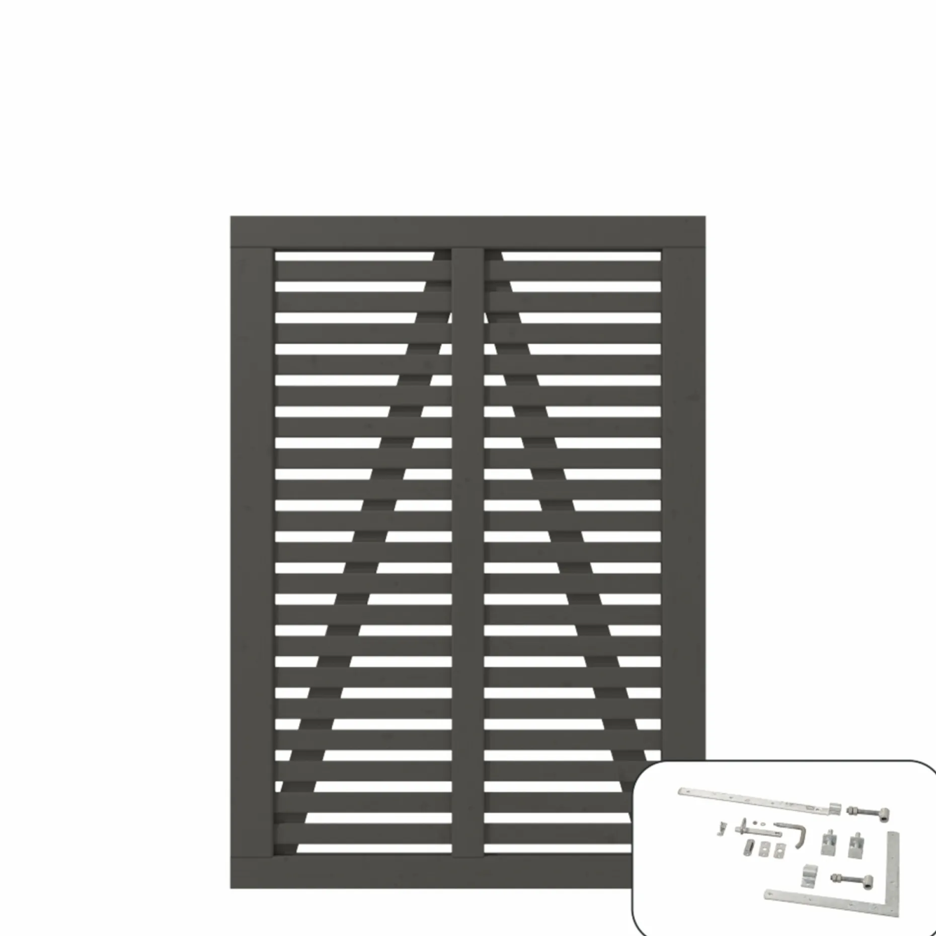 Beslag medfølger, så lågen kan fæstnes til stolper. Kombinationen af behandling, grundmaling og beslag giver et samlet produkt, der beskytter træet og understøtter et ensartet udseende.
