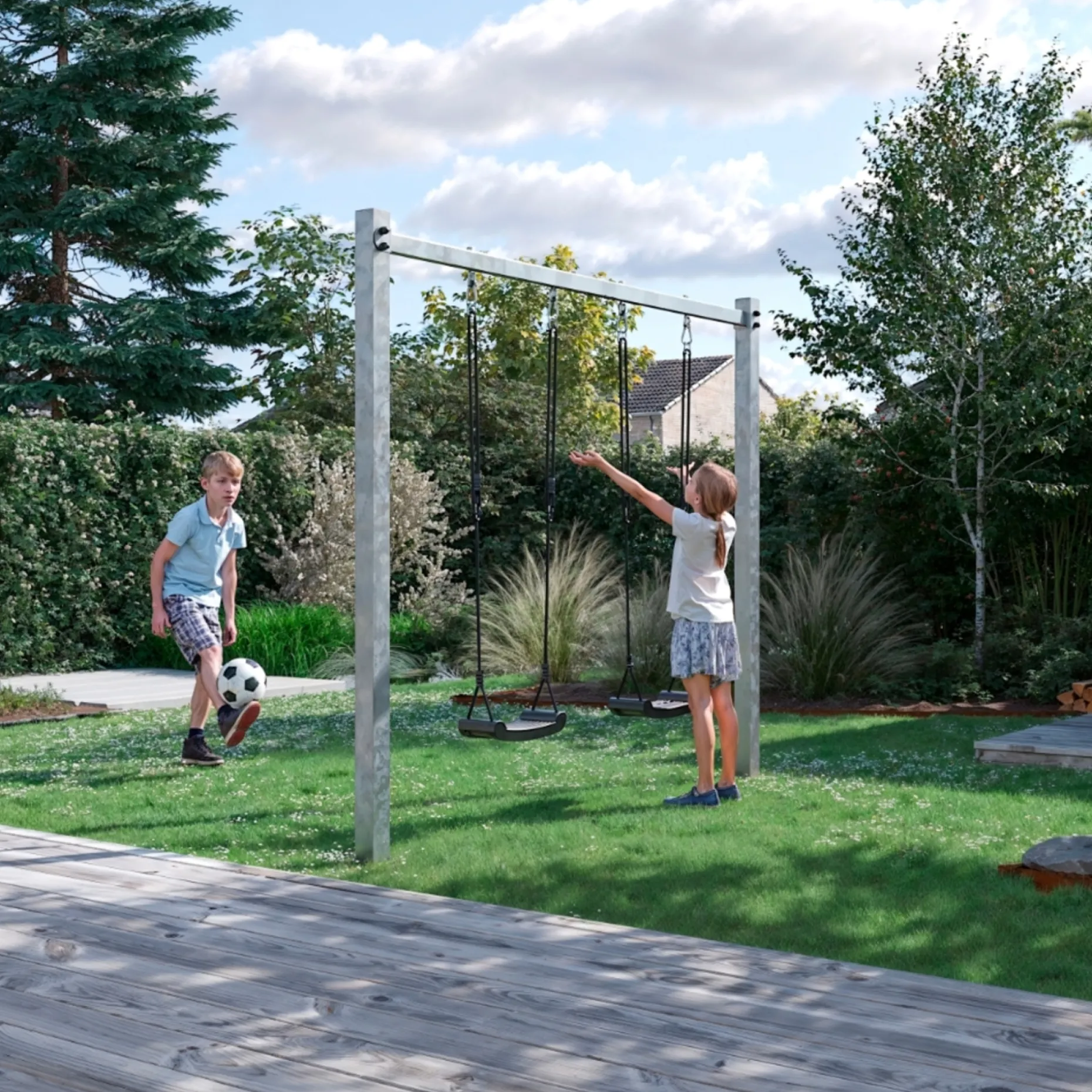 Timevis af sjov i familiens have sikres af de to gynger, som inviterer både små og større børn til lege med sving og rytme.