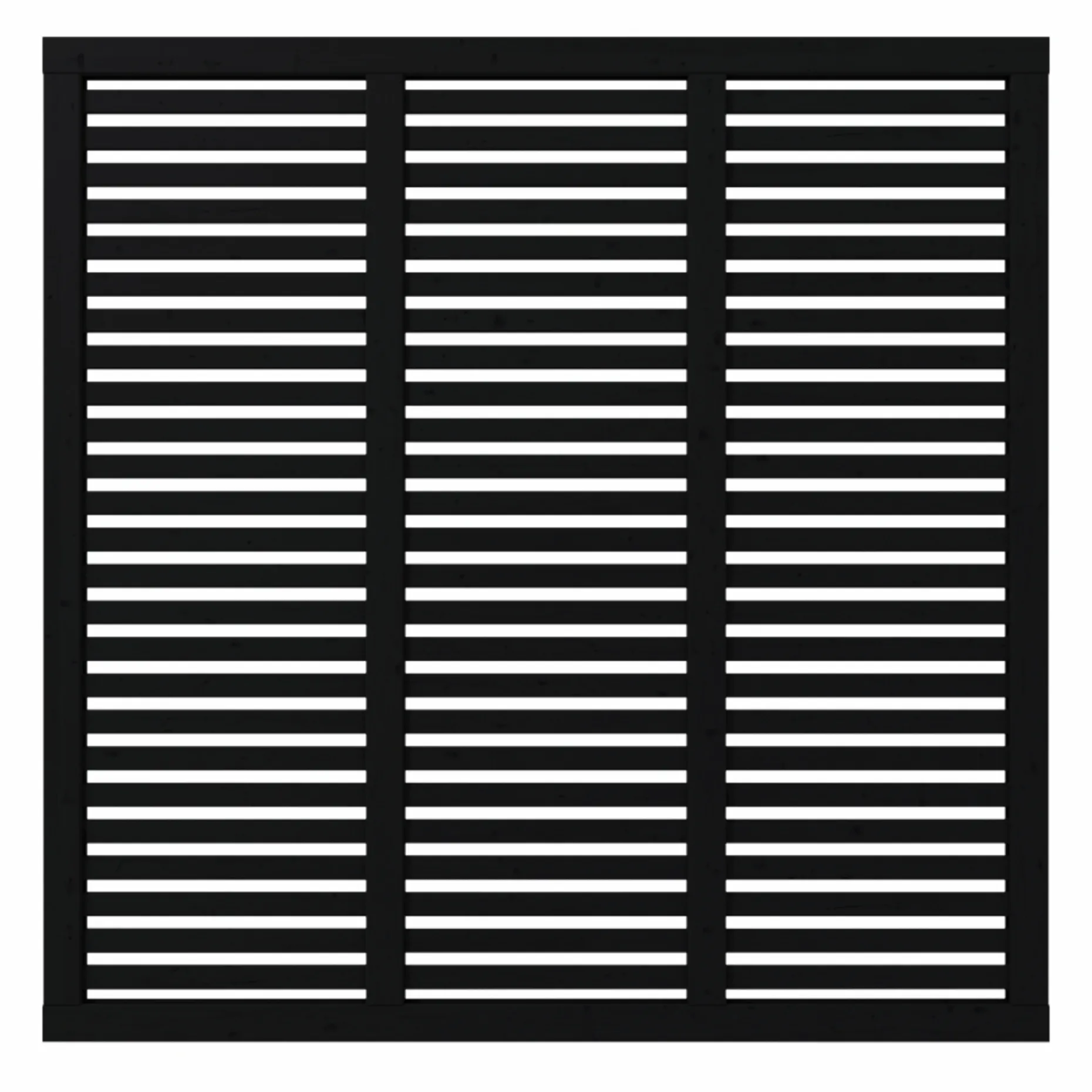 Den sorte overflade i RAL 9005 fremhæver de grafiske linjer og persienneeffekten, så hegnet både afskærmer og fungerer som dekorativ baggrund.