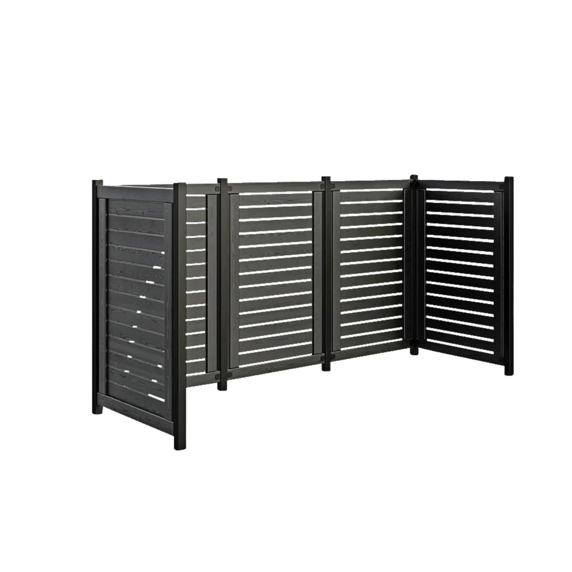 Renovationsskjulet består af hegnsfag i sortmalet nåletræ, en løsning der giver en afdæmpet og diskret overflade. Den sorte behandling gør, at skjulet fint passer til mange husstilarter og udendørs omgivelser, så det ikke fremstår dominerende i en lille forhave. Skjulets opbygning giver et ensartet og velordnet udseende, som understøtter et pænt og funktionelt udemiljø.
