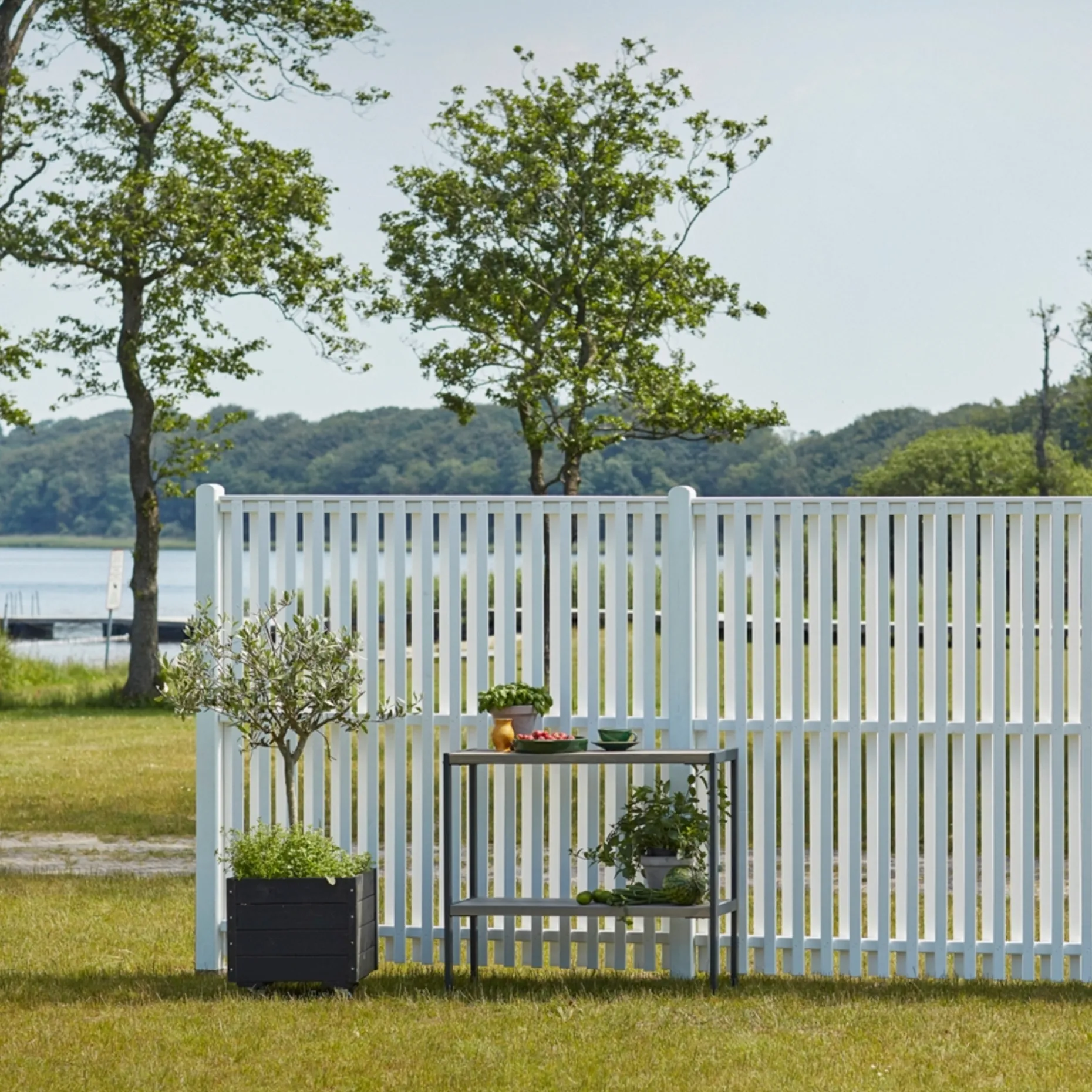 NAGANO hegnet giver dit uderum et frisk pust af klassisk harmoni. Den lille afstand mellem de smalle, lodrette lameller lader solens stråler passere, samtidig med at det giver en effektfuld opdeling i uderummet. De smalle lameller skaber visuelt lethed samtidig med god afskærmning, så du bevarer både lys og privatliv. Hegnet er fungicidbehandlet og grundmalet to gange i hvid, hvilket giver en jævn, lys overflade og ekstra beskyttelse mod svampeangreb. Det grundmalede lag sikrer et ensartet hvidt udtryk, der gør hegnet velegnet til både moderne og klassiske uderum. Brug hegnet til at skabe tydelige afdelinger på terrasse og i have, eller som en lys bagvæg ved udepladser.