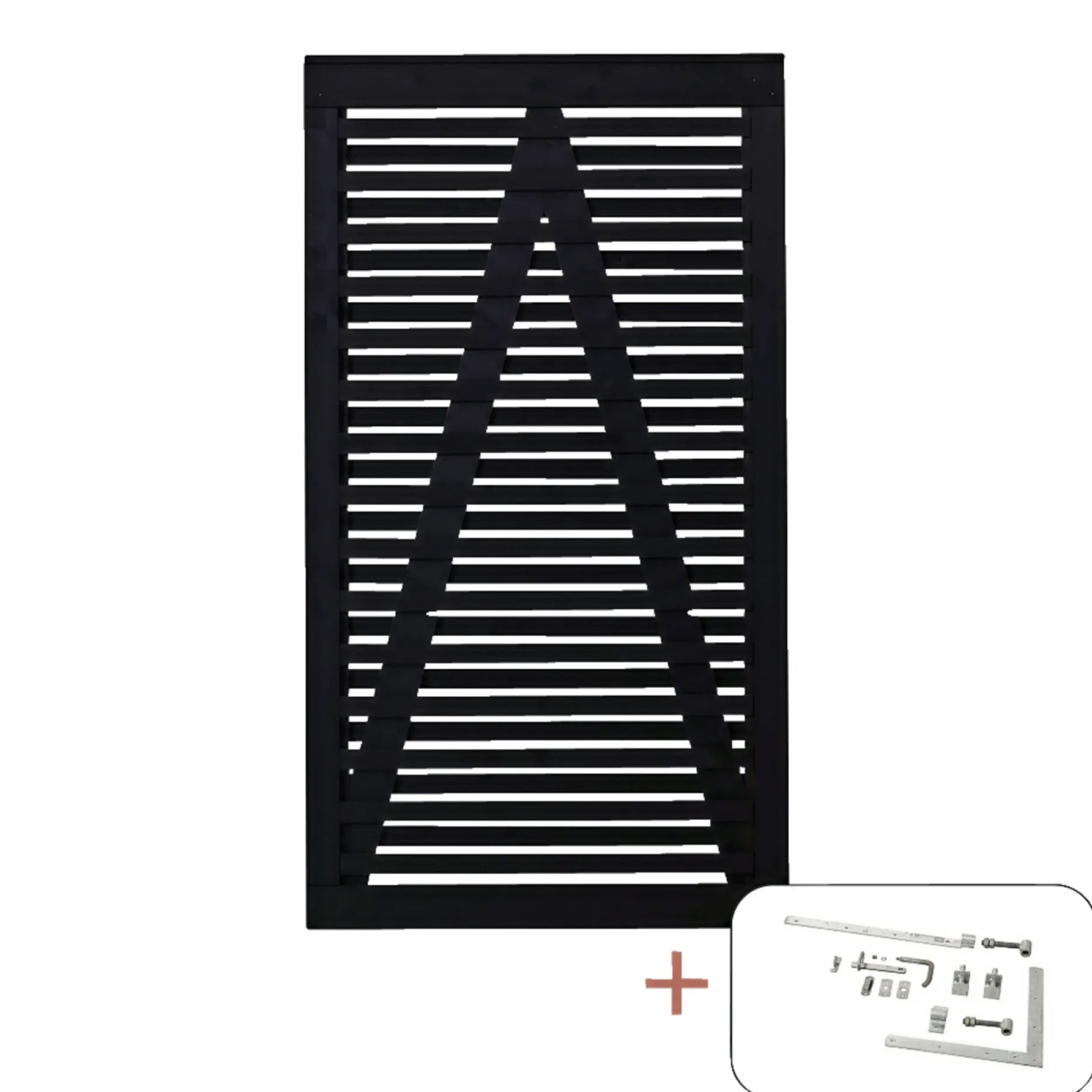 Osaka enkeltlåge inkl. beslag – 100×180 cm. Osaka-serien er en elegant og trendy hegnsløsning. Listerne er forskudt fra hinanden, hvilket skaber en diskret 3D-effekt og samtidig mulighed for at lade blikket passere ud til de omkringliggende omgivelser. De vandrette lister i sortmalet træ giver ro i omgivelserne og inviterer til at koble af og nyde øjeblikket. Lågen er fungicidbehandlet og grundmalet i sort, hvilket giver en beskyttende overflade og et ensartet udseende. Leveres med varmgalvaniserede beslag, så montering er forberedt og robust.