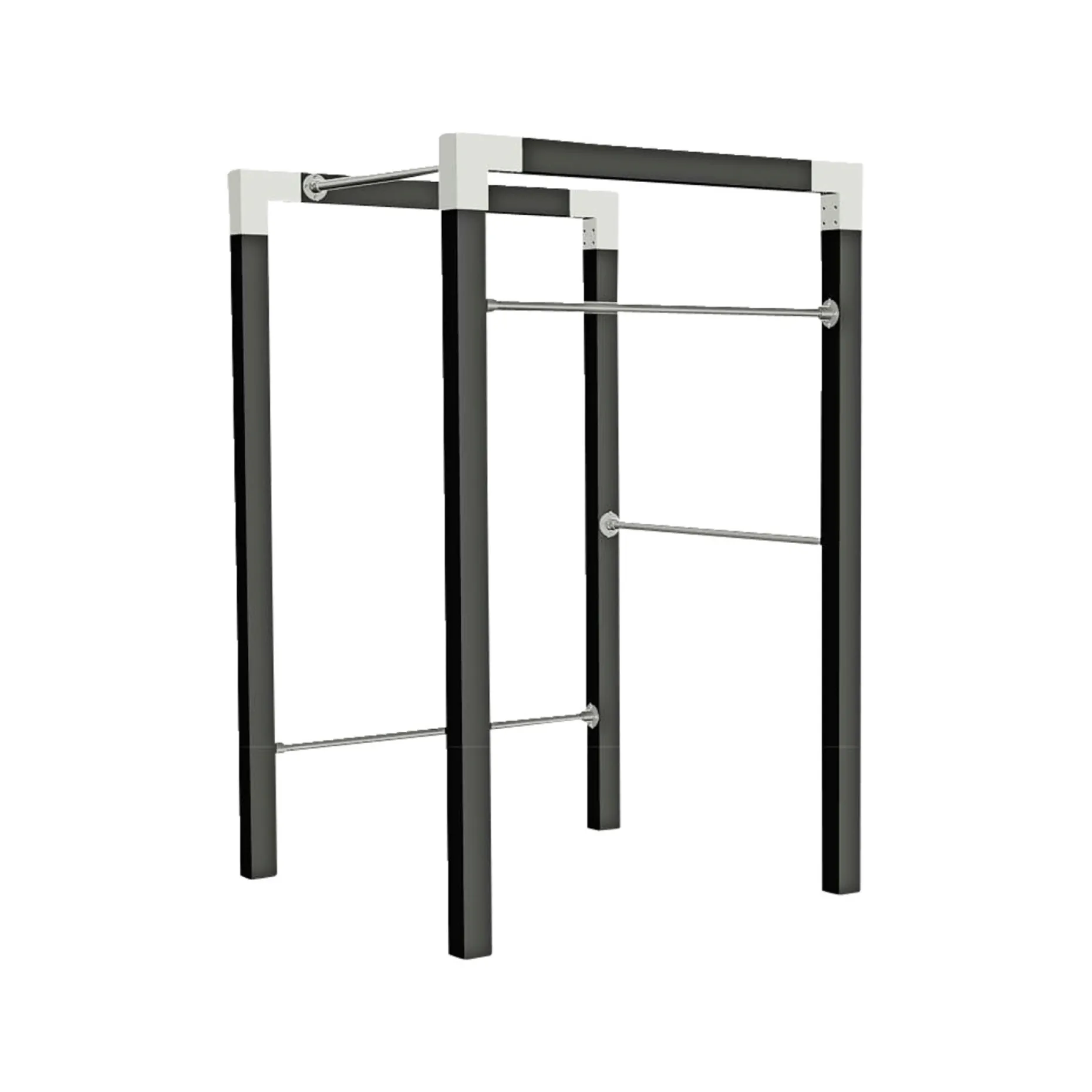 PLUS Outdoor fitness – Model 1 er et sort udendørs fitnessstativ med mål 220 x 138 x 138 cm. Produktet leveres som saml-selv og indeholder stolper, cubic hjørnebeslag samt galvaniserede stålrør.