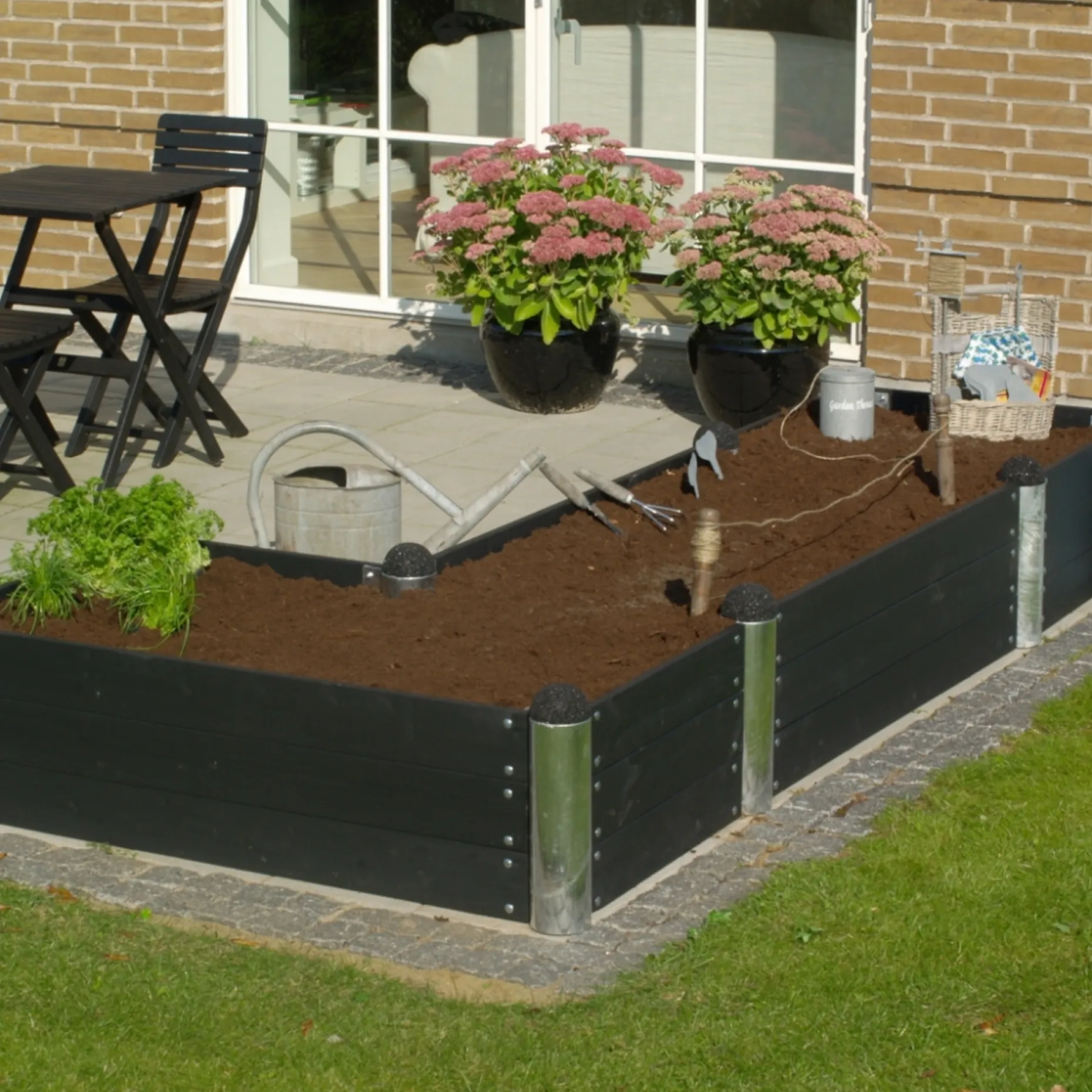 Samlet med de medfølgende M8×35 mm bolte og de tre flanger giver modulet en stabil forbindelse, så højbedet holder formen under almindelig brug. Den sorte top af genbrugsgummi skaber et samlet og robust finish.