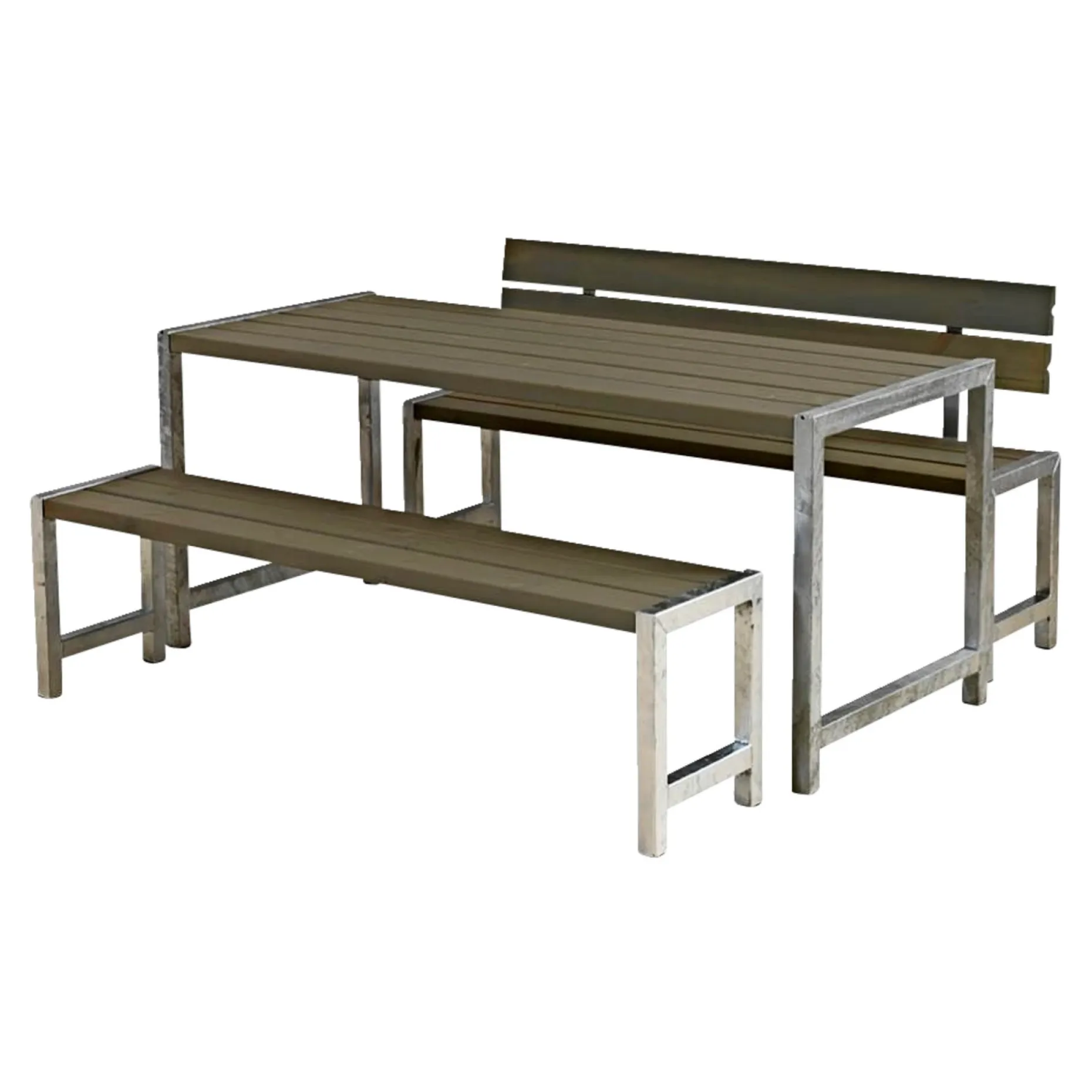 PLUS PLANKESÆT GRÅBRUNPlankesæt m/1 ryglæn – 186 cm – GråbrunVarenr. består af: 1 stk. bord og 2 stk. bænke samt 1 stk. ryglæn.Inkl. justérbare stillesko.Planker:42×116 mm nåletræ.Trykimprægneret og grundmalet gråbrun.Nærmeste RAL 7023 – vandbaseret. Varenr. 19816-18.Bord:Længde 186 cm – bredde 77 cm – højde 73 cm.Bænke:Længde 176 cm – bredde 38 cm – højde 45 cm.Ryghøjde 81 cm.Siddepladser: 6 (3 pr. bænk).Øverste planke på ryglæn er med hældning for bedre komfort.Stel/ben: 45×45 mm varmgalvaniseret stål.Justérbare stillesko (0-15 mm).Leveres som “Saml selv”.Efterbehandling af dine PLUS produkterTages møblerne ind om vinteren, passer bænken perfekt under bordet.Der er nemlig en smule forskel i bord- og bænkeplankernes længde, og det sparer plads i redskabsskur eller garage, så andre ting og sager også kan få husly i den kolde tid.Trykimprægneret og grundmalet