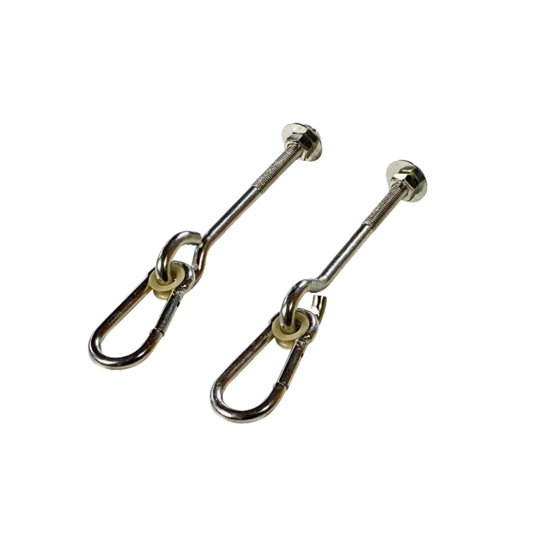 PLUS Gyngeophæng m/bolte 26CM er et sæt varmgalvaniserede karabinhager til ophængning af gynger. Leveres som 2 stk. pr. pose og passer til PLUS gyngestativer i træ. Godstykkelsen på 12 mm skaber et solidt ophængspunkt, og hver karabinhage er dimensioneret til en maksimal belastning på 100 kg.