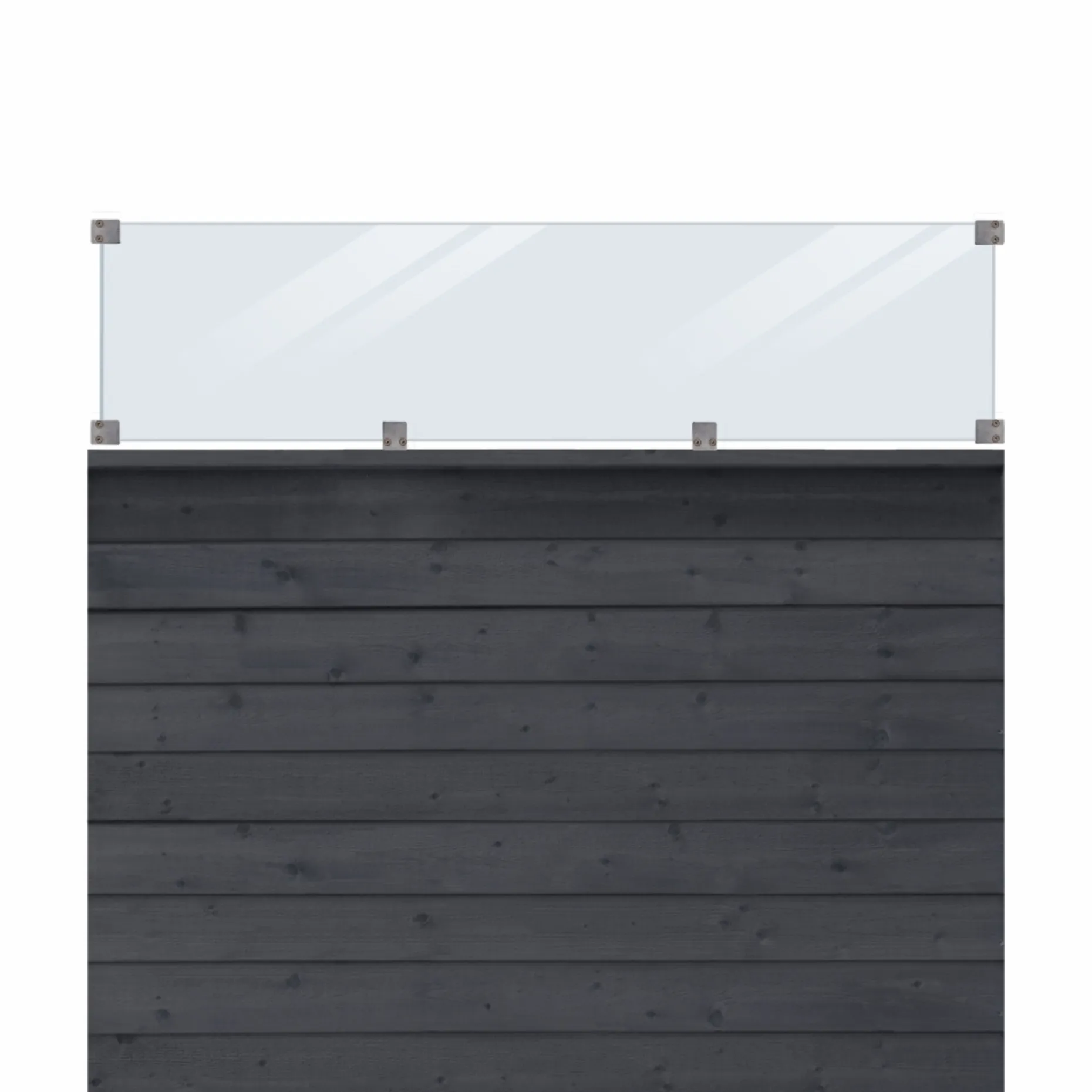 Glaselementerne giver ekstra lysindfald og et lettere visuelt udtryk, mens træets trykimprægnering bidrager til holdbarheden i udendørs miljøer. Kombinationen gør det muligt at afskærme uden at lukke helt af, så terrassen kan forblive lys og inviterende. Hegnet kan anvendes alene eller i samspil med beplantning for et blødere udtryk.