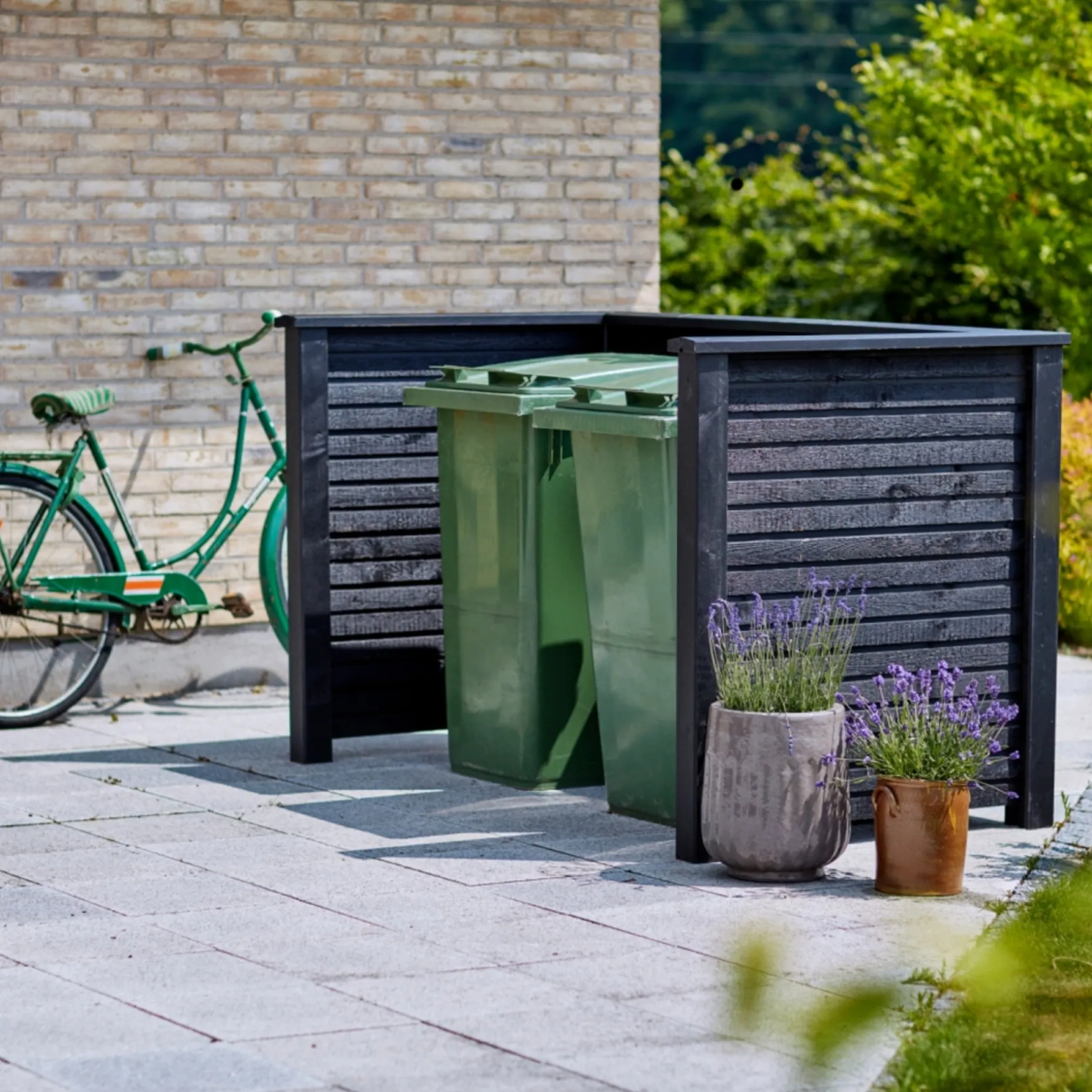 PLUS Renovationsskjul Plank i sort er et praktisk og stilrent skjul til skraldespande.