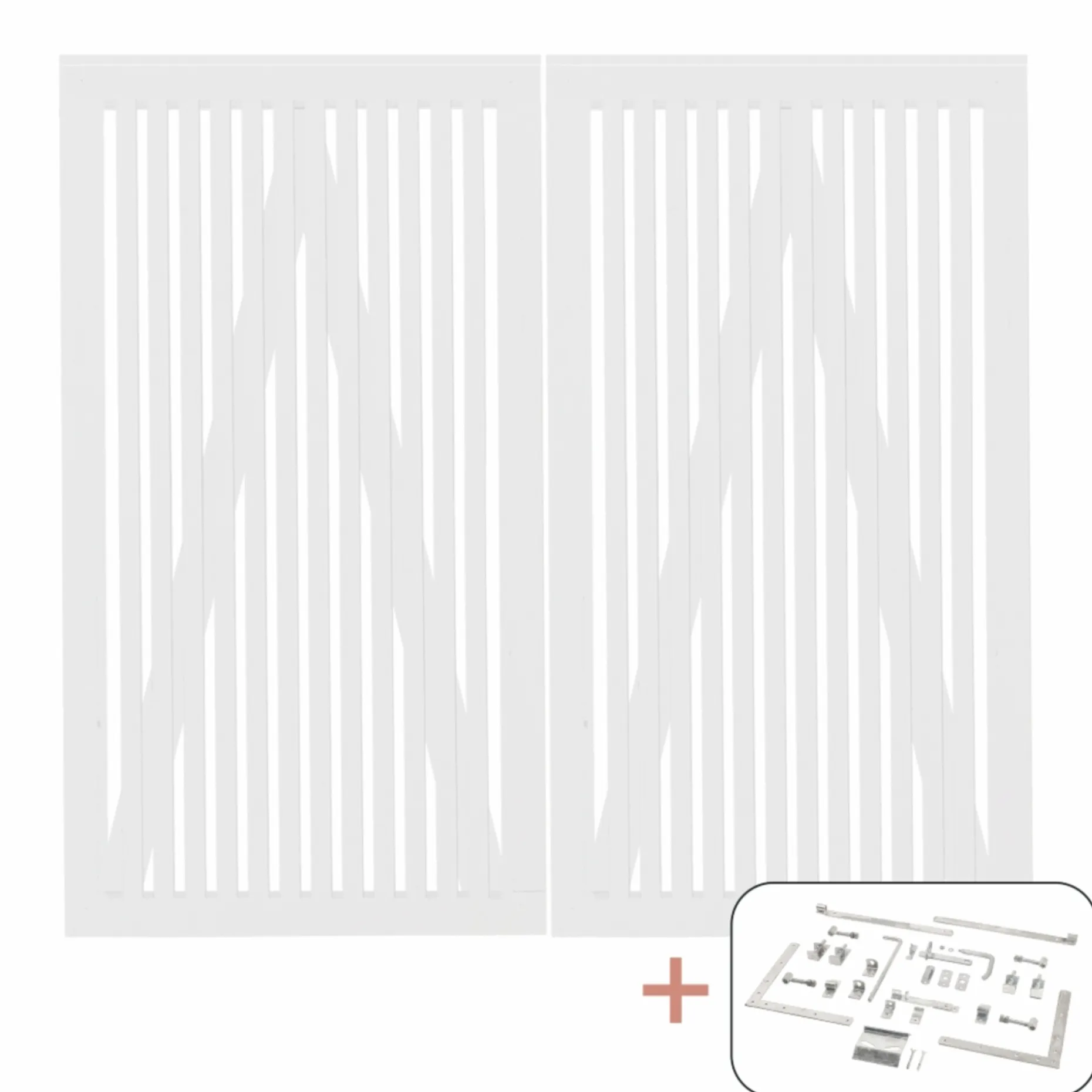 PLUS Sendai dobbeltlåge leveres inkl. beslag og er udført i hvid finish. Lågen er fungicidbehandlet og grundmalet 2 gange for øget holdbarhed. Den har et åbent og transparent udtryk, hvor smalle lister virker kamouflerende, så omgivelserne kun anes svagt.