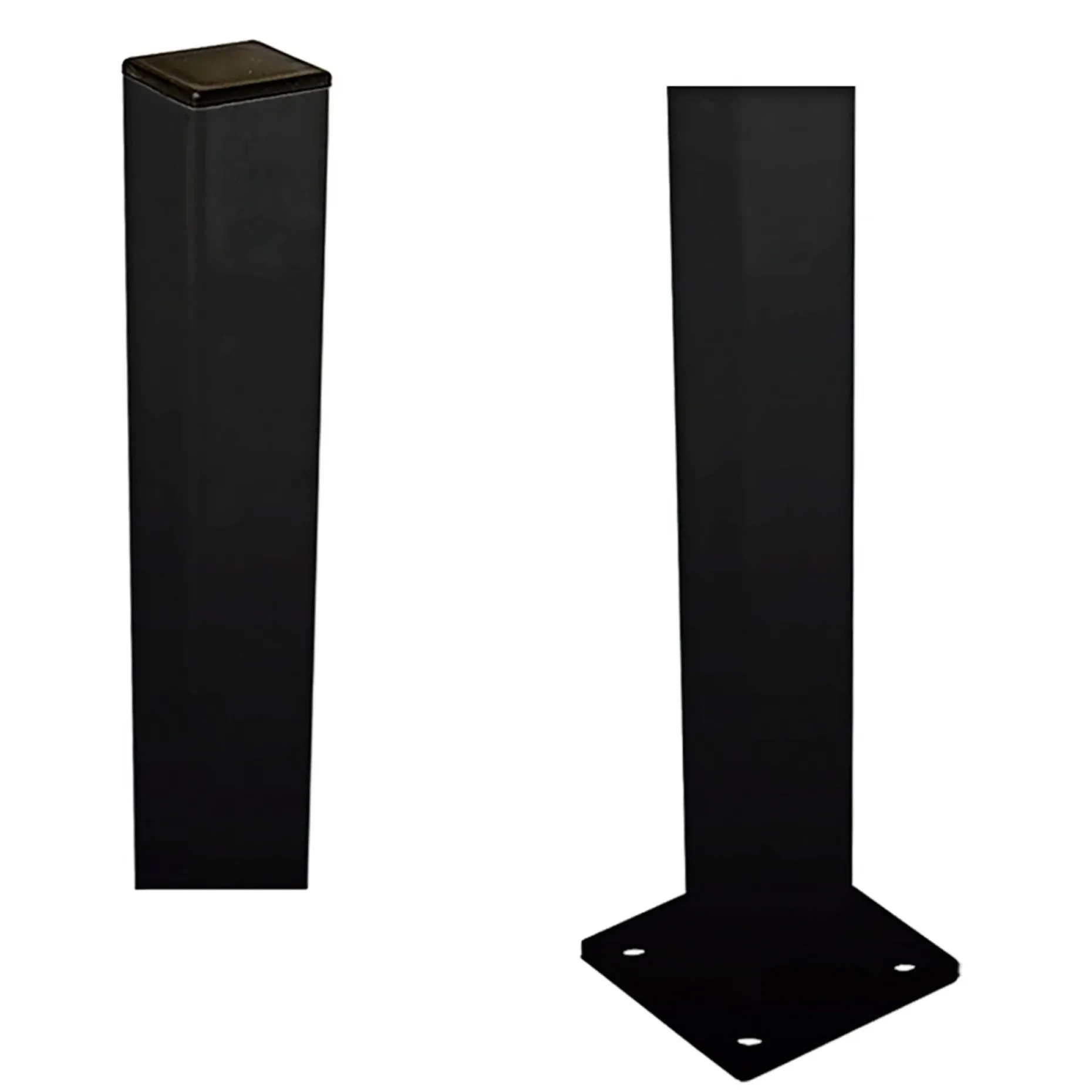 Stålstolpe med fod og stolpeafdækning i sort, varmgalvaniseret og pulverlakeret. Dimensioner 4,5 x 4,5 x 95 cm. Stålstolper er et holdbart alternativ til træstolper, da de ikke kræver vedligeholdelse eller efterbehandling med maling.