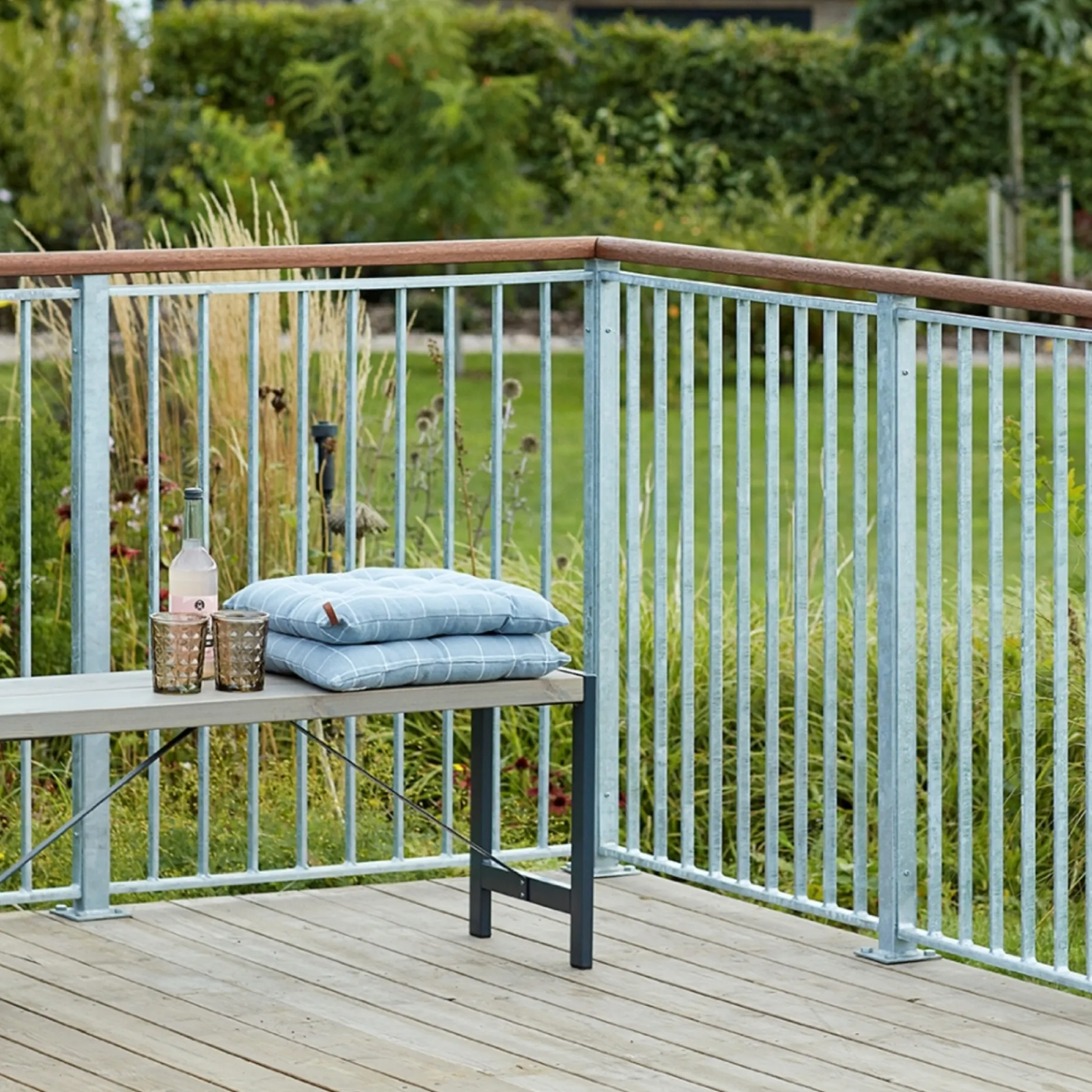 Den varmgalvaniserede overflade beskytter stolpen visuelt og bevarer udseendet, så rækværk og håndliste fremstår ensartede uden hyppig maling.