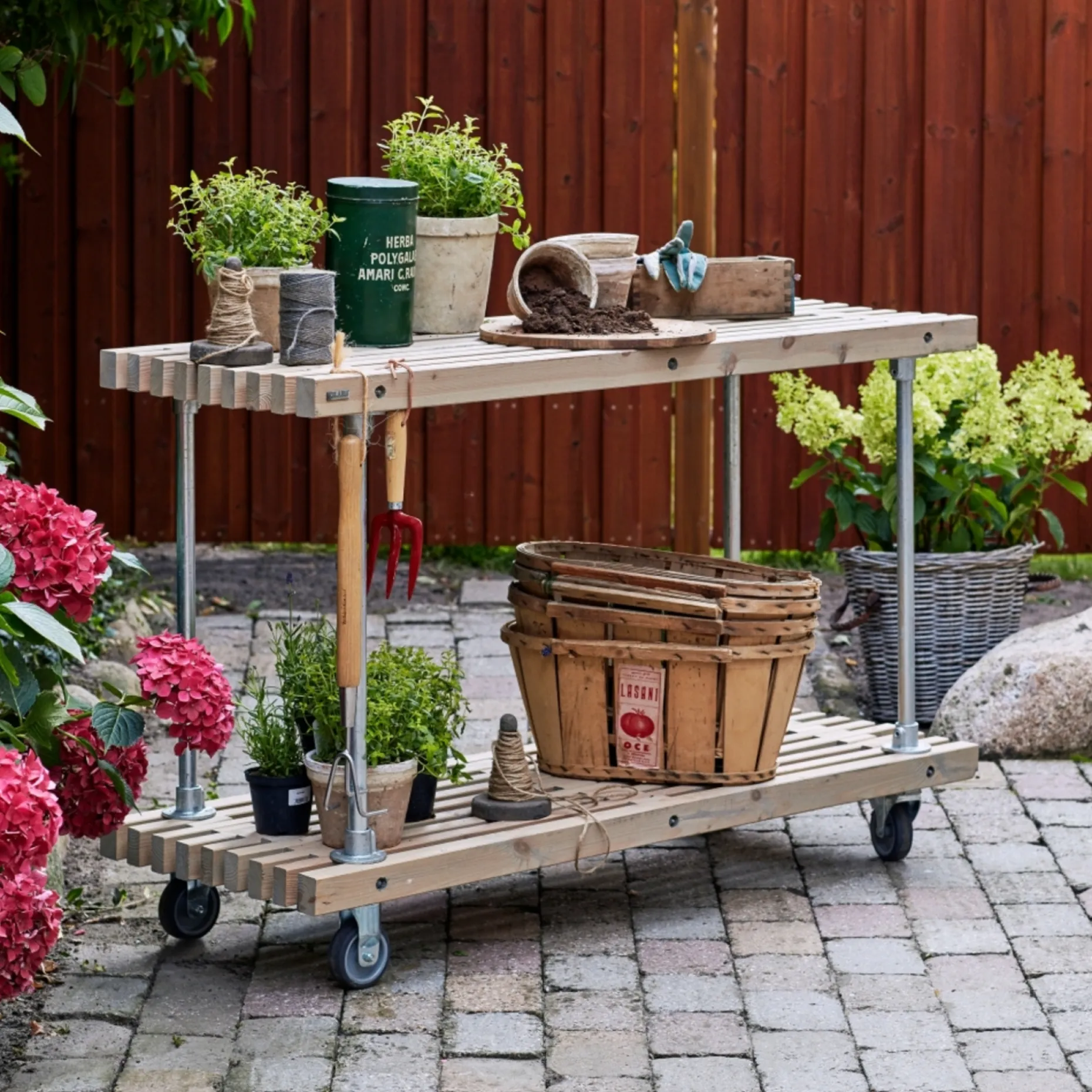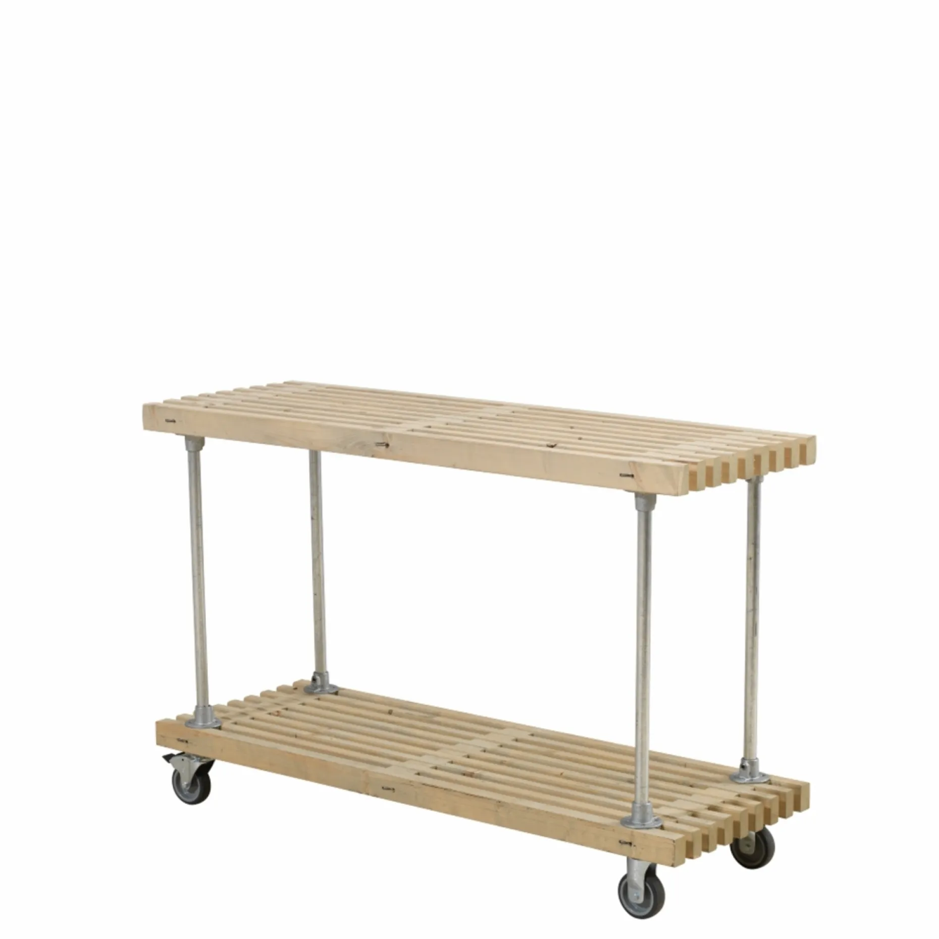 Produktet er råt og rustikt, derfor kan der forekomme harpiksudtræk og revner i træet. Der er mulighed for at efterspænde trallerne via de gennemgående gevindstænger.