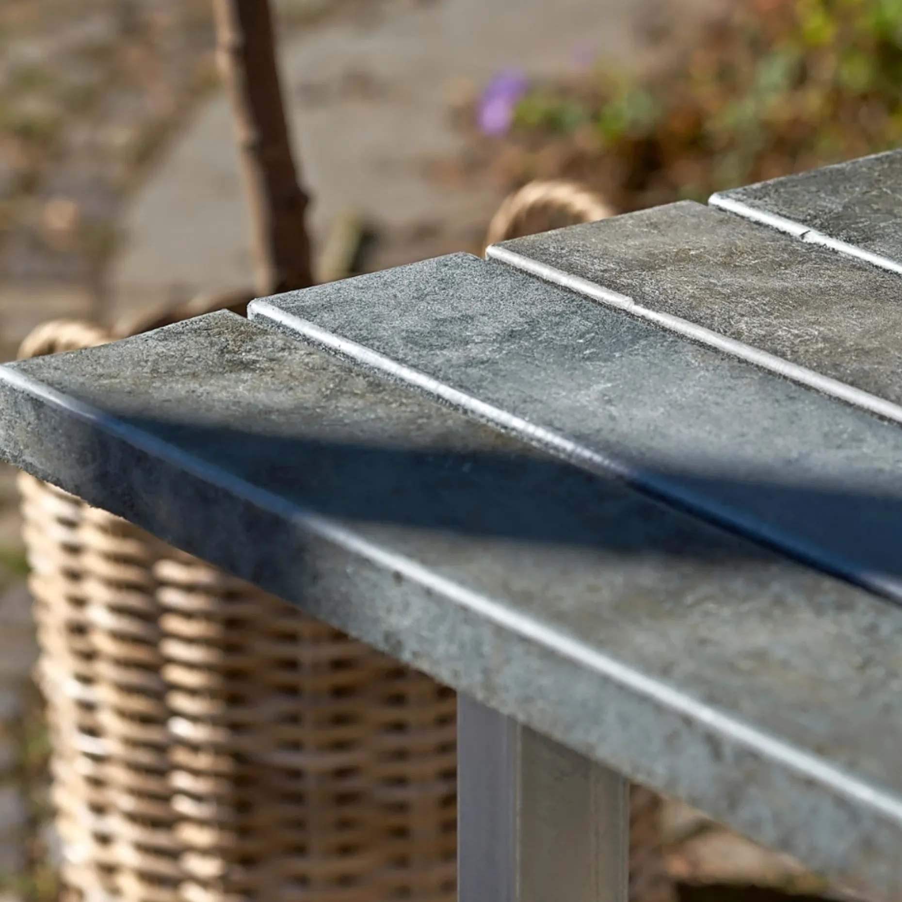 Rustik overflade og struktur. Hver planke er unik og farver kan derfor variere. Massive planker forstærket med stålprofil. Afrundede kanter. Vedligeholdelsesfrit og gennemfarvet.