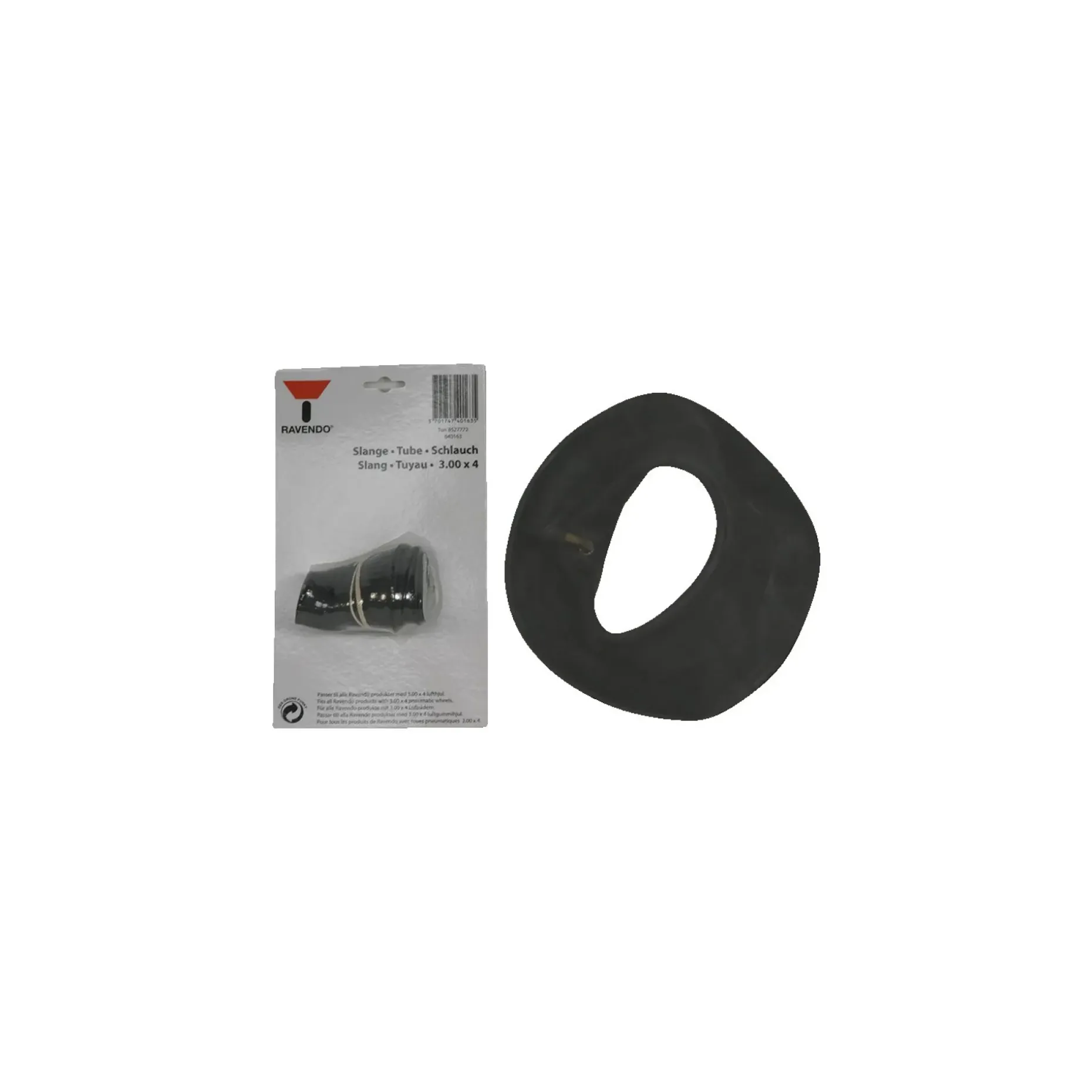 RAVENDO SLANGE T/SÆKKEVOGN er en slange tiltænkt brug ved sækkevogne. Produktets centrale dimension er 3.00 x 4, angivet flere steder som 3.00X4.