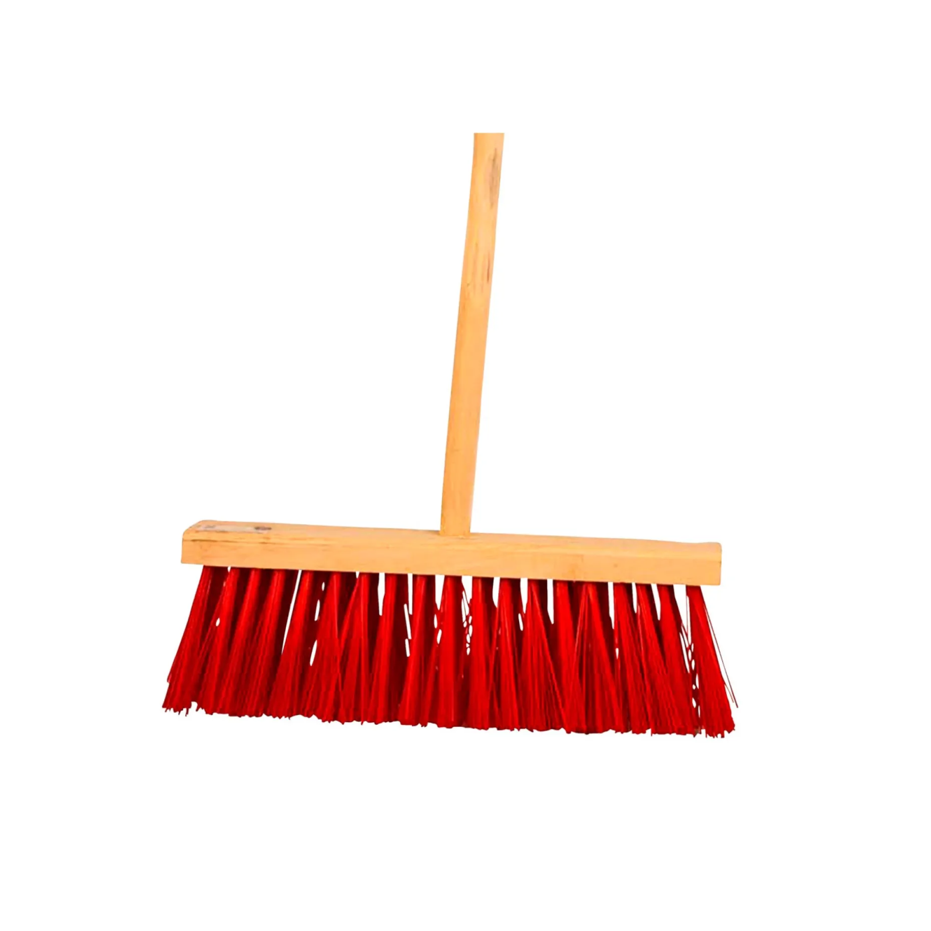 Gadekost til udendørs rengøring med røde PVC-børster, der giver effektiv fejeevne på hårde flader. Børsterne måler 300 x 76 mm og er arrangeret som 15×5 rk., hvilket sikrer bred dækning og god affjedring ved fejeopgaver. Produktet leveres med limet skaft for stabil samling og lang holdbarhed under normalt brug.