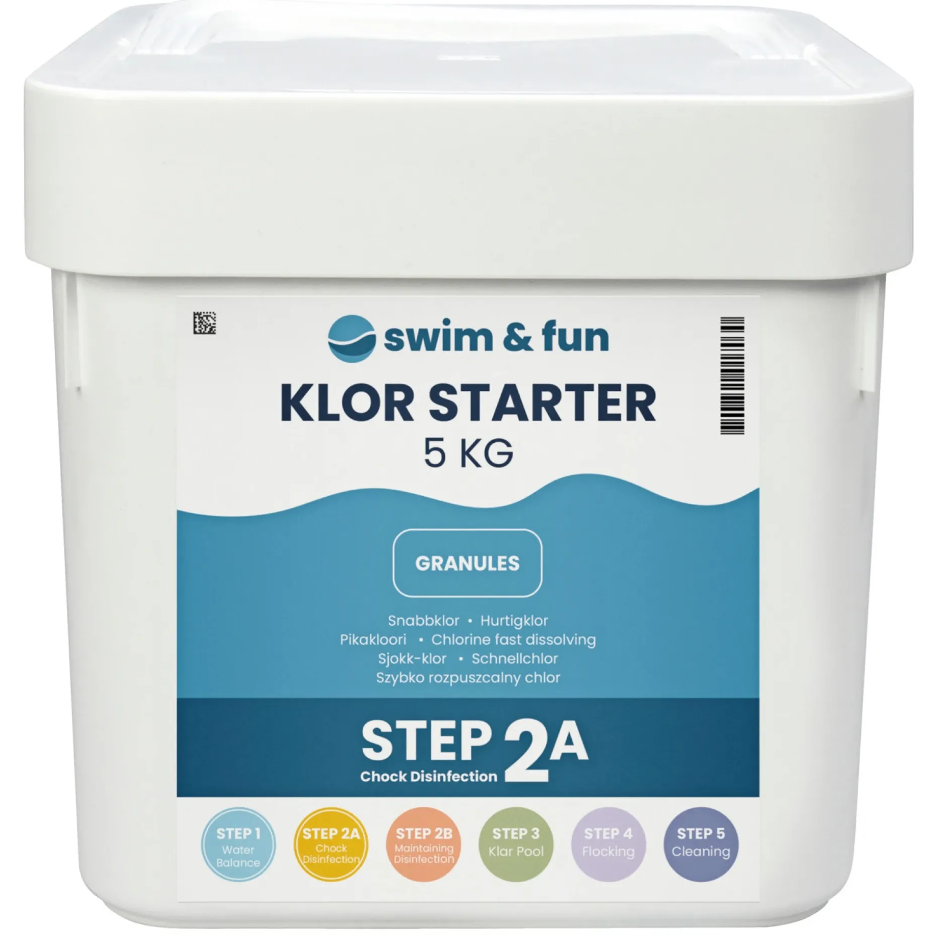 Klor Starter hurtigklor granulat leveres i praktisk plastbeholder med børnesikret låg. Beholderen er påtrykt udførlig brugsanvisning på de nordiske sprog samt engelsk.