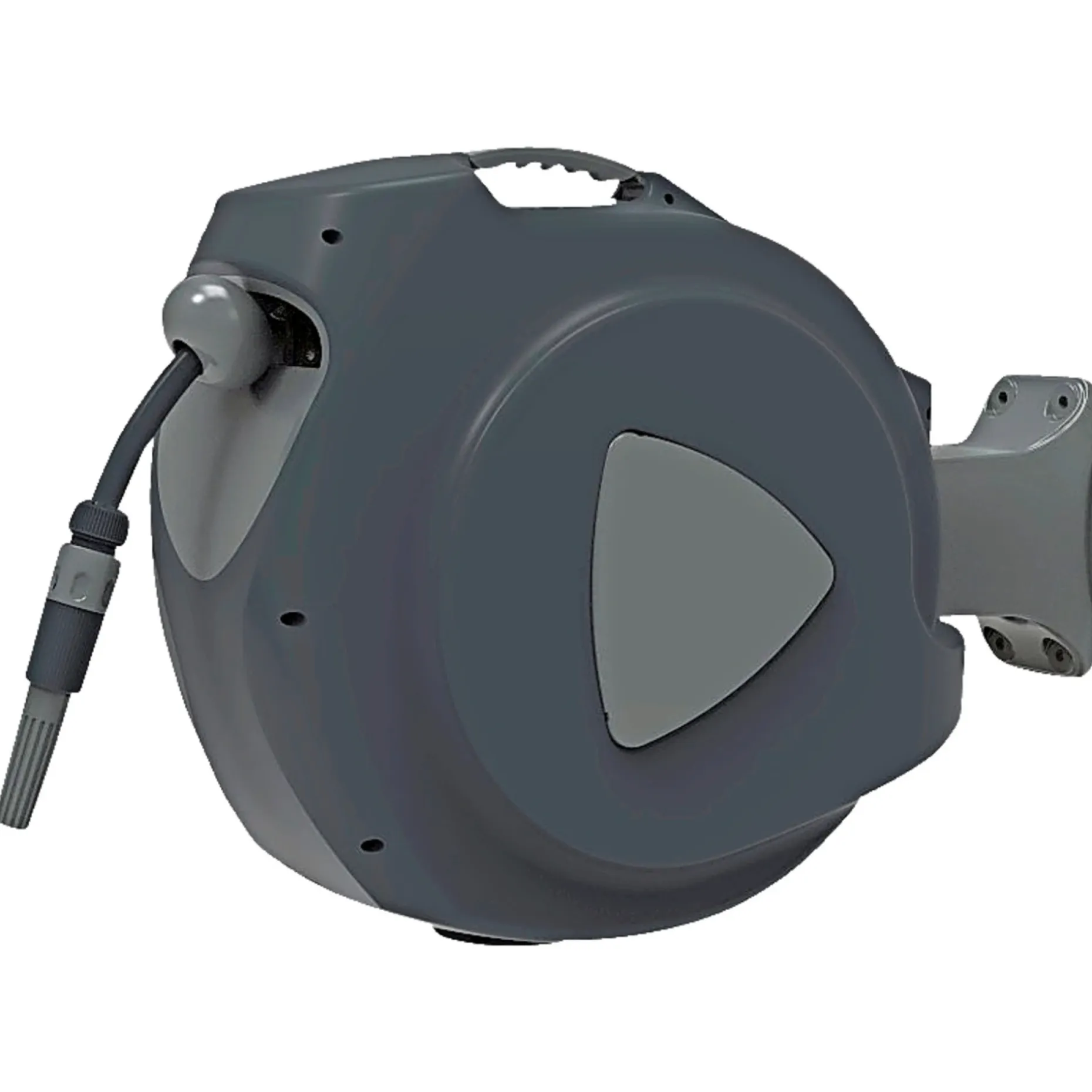 Inkl. rawplugs og skruer. Guidet oprulningssystem, så du undgår knæk og snoning af slangen.