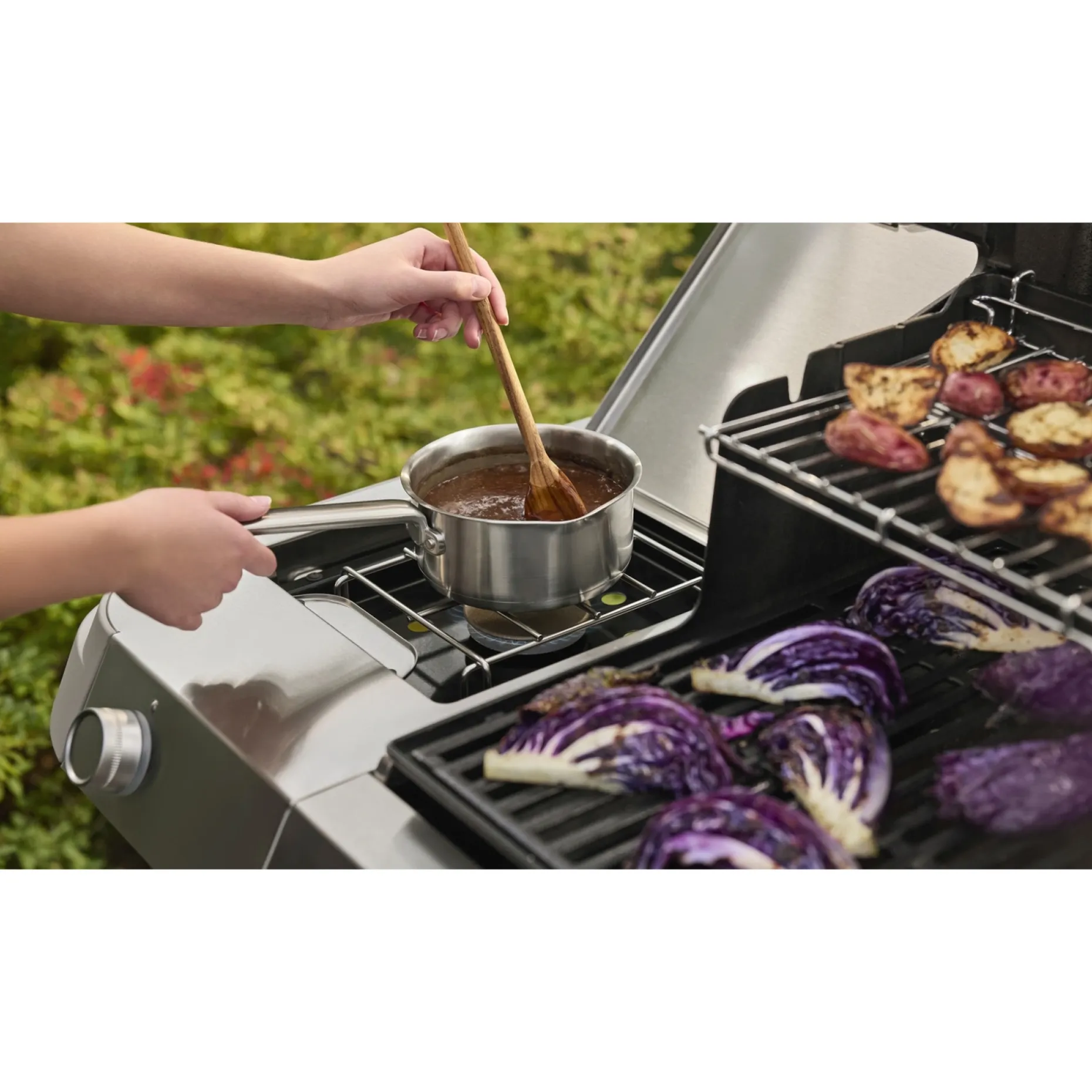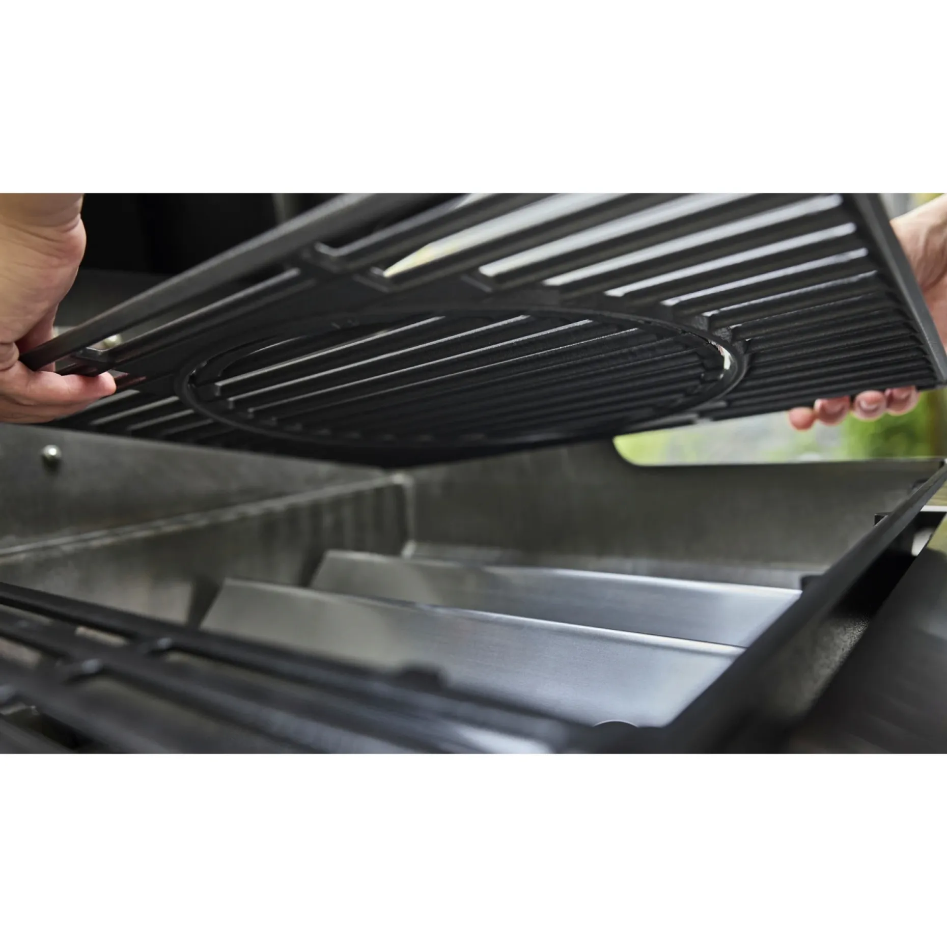 - Plads til Weber Works drop-in tilbehør og snap-on-tilbehør på sideskinner; begge dele er tilkøb.